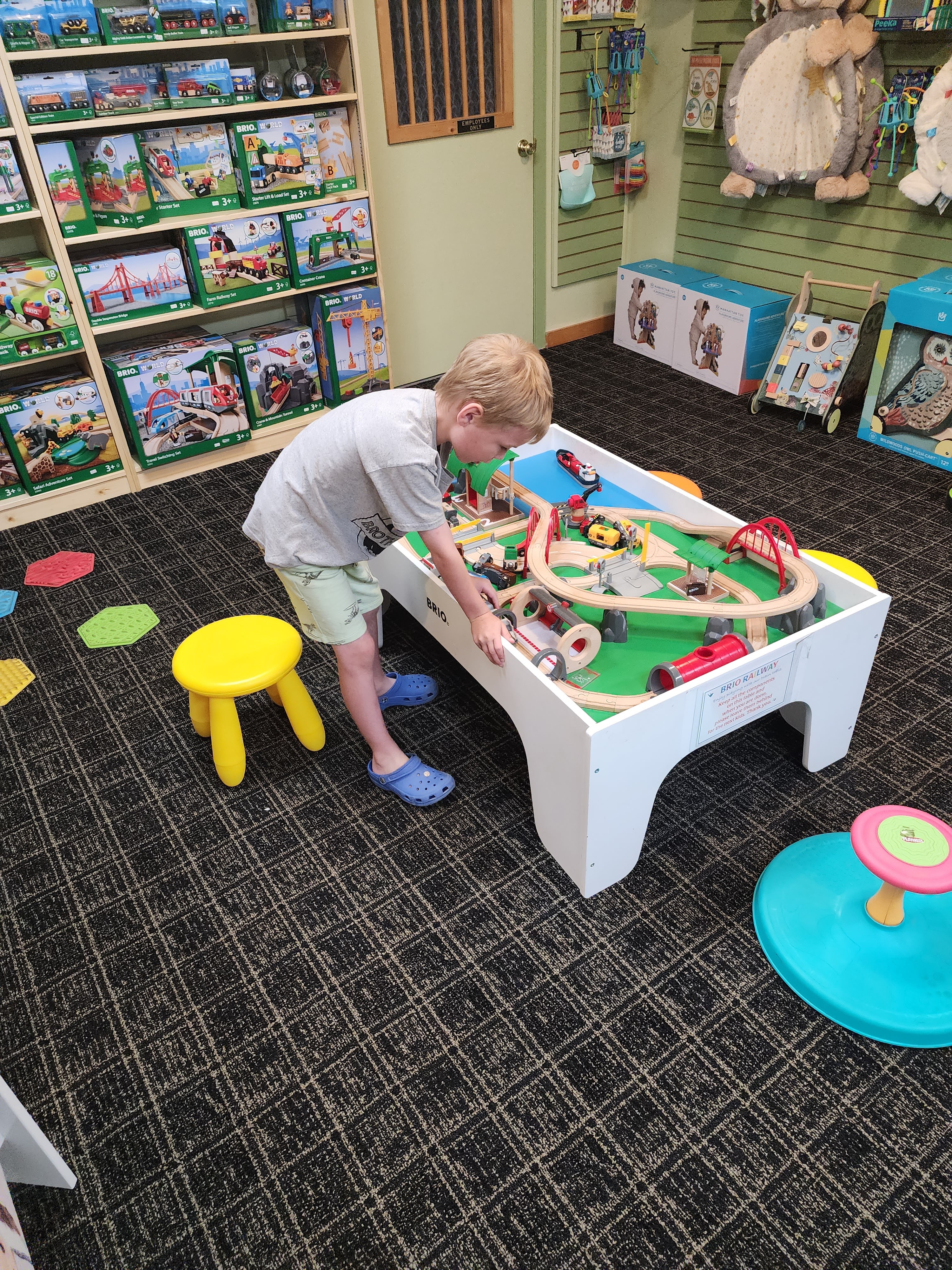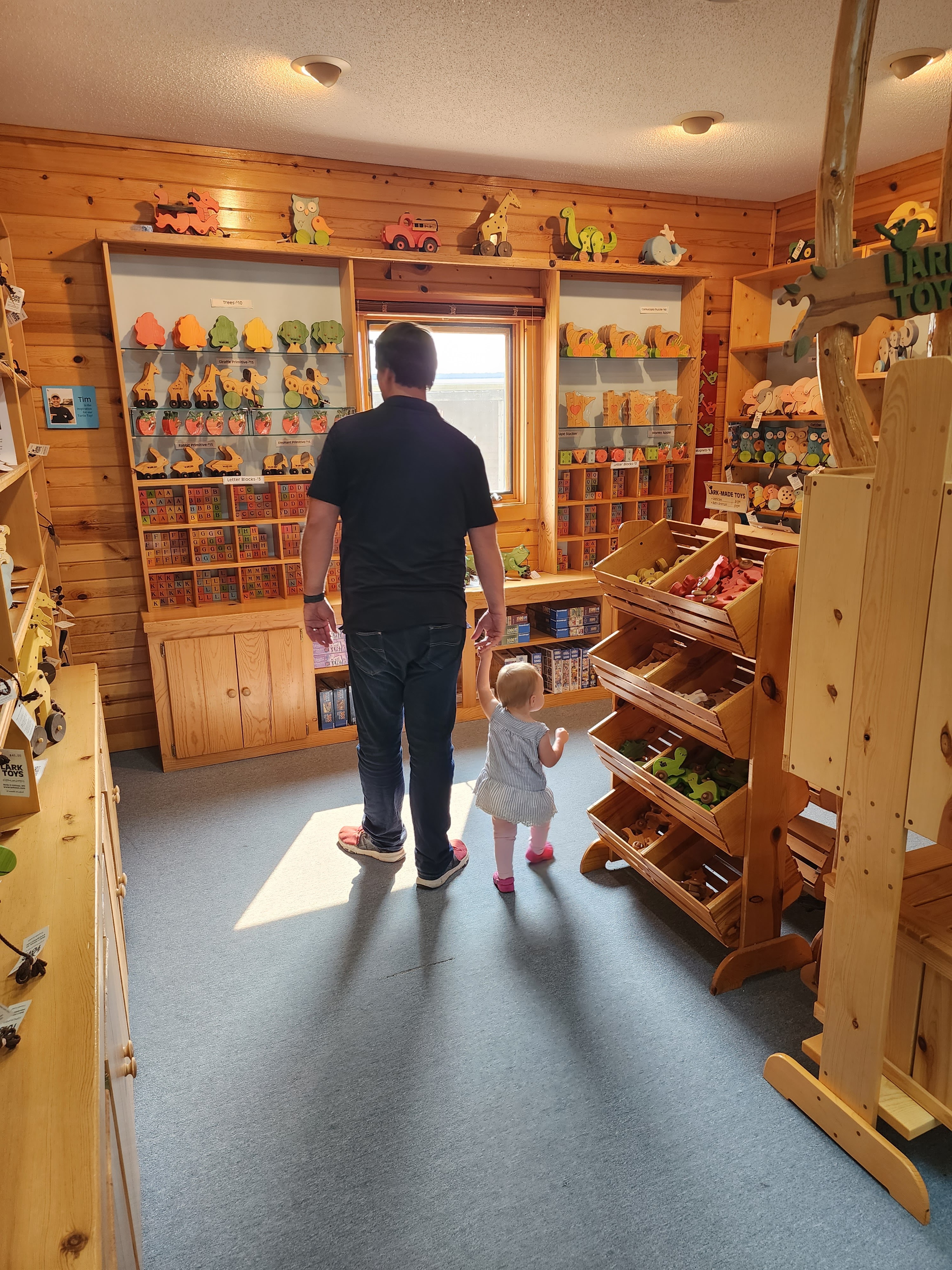 After that, we finally made our way into the part of the store with actual toys for sale. Each room was more beautiful than the last and was filled with even more toys. There was a board game room, a wooden toy room, a sports and dress up space, a pretend play space, a sensory space, a train space…I could continue on and on. Every room was filled with toys that we either love or we would love to have. My kids loved that there were areas to play in almost every room. They quickly surveyed the room and then, got busy doing what kids do best…playing. The play areas were clean, fun, and sparked imagination. When we thought things couldn’t get any better, we entered the bookstore part of Lark Toys. Oh boy, if you know our family, you know we LOVE our books! It was like we had stepped into a favorite book store. We found books we already owned and books that we wanted on every shelf. Cozy nooks and crannies that begged you to sit down and enjoy a book were nestled throughout the store. Before long, it was almost closing time and we had to make a stop at one of our favorite places there…the ice cream store. Next to the ice cream store, there was an old fashioned candy store. This too brought up many memories, as we chatted to our kids about the candy stores we visited as kids. We grabbed our ice cream, which was delicious, and left the store. As closing time hit, we sat on a bench outside to finish our ice cream before driving to our hotel. Sitting and eating, the owners walked by on a walk with their llamas. Yes, you read that right. The owners were so kind to my kids and stopped their walk and came over to us. Each kid got to pet the llamas and we were overwhelmed at this amazing experience of Lark Toys, hidden away in a quaint small town. There was also, a large mini-golf course that we were unable to do in our time frame. A good chunk of a day could definitely be spent at this absolute delight of a place. We will most definitely be going back at some point and giving ourselves a lot more time.