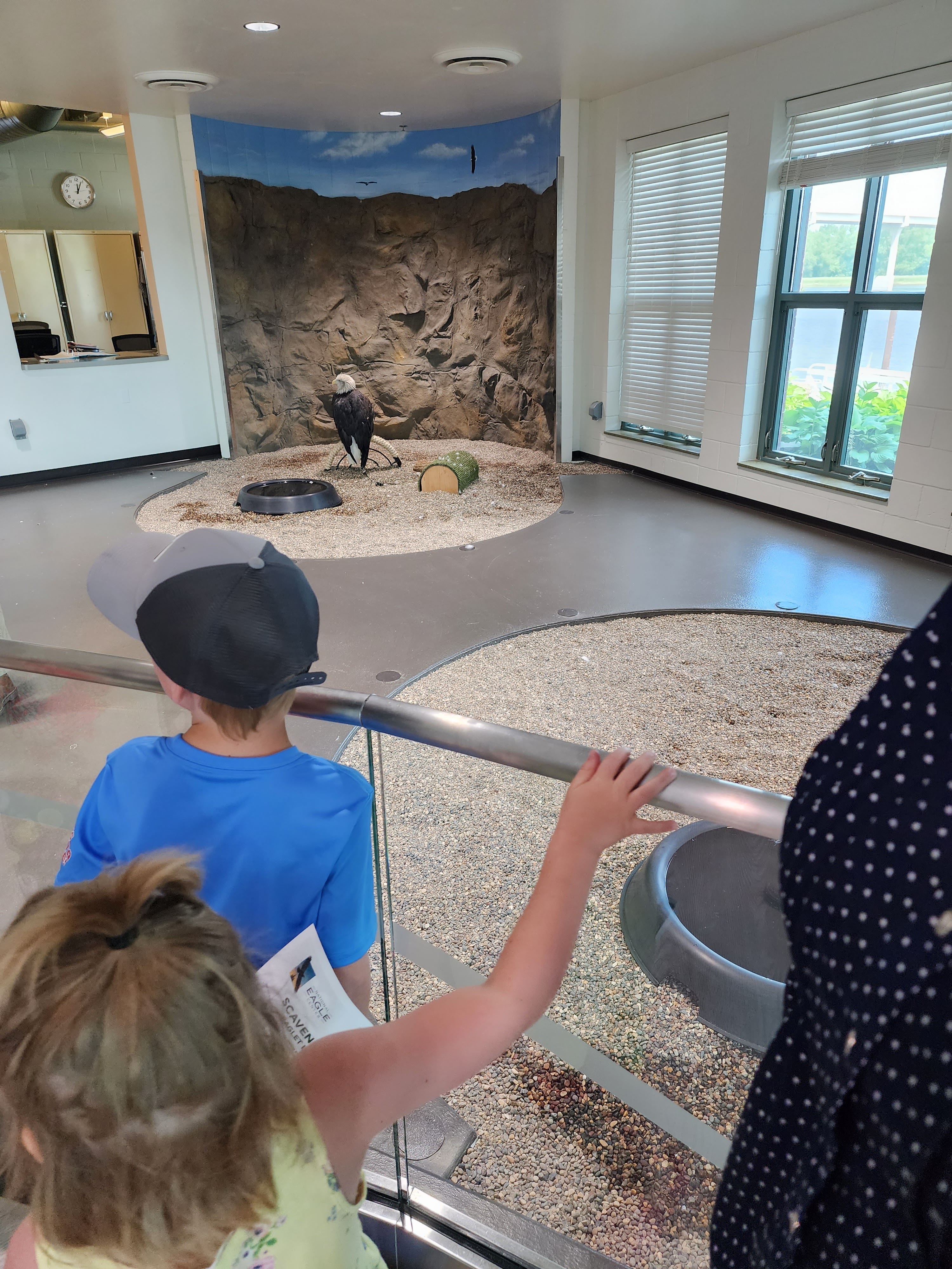 After the show was finished, we headed into the National Eagle Center. On the bottom floor, my kids enjoyed the kid’s area where they could trace different things and attempt to build a pretend eagle nest. They also, enjoyed seeing the bald eagles in this area. The top floor was full of more history and information, which was a little harder for our young kids. Yet, we did enjoy reading and learning. An art area was also, upstairs with a variety of pieces of art. Last, there was a beautiful deck overlooking the river. Here, the kids enjoyed looking for raptors and being so high up in the air. Overall, the kid’s favorite part of the National Eagle Center was definitely the show and I would recommend going to one if you have kids along, or if you want to truly learn a lot about eagles.