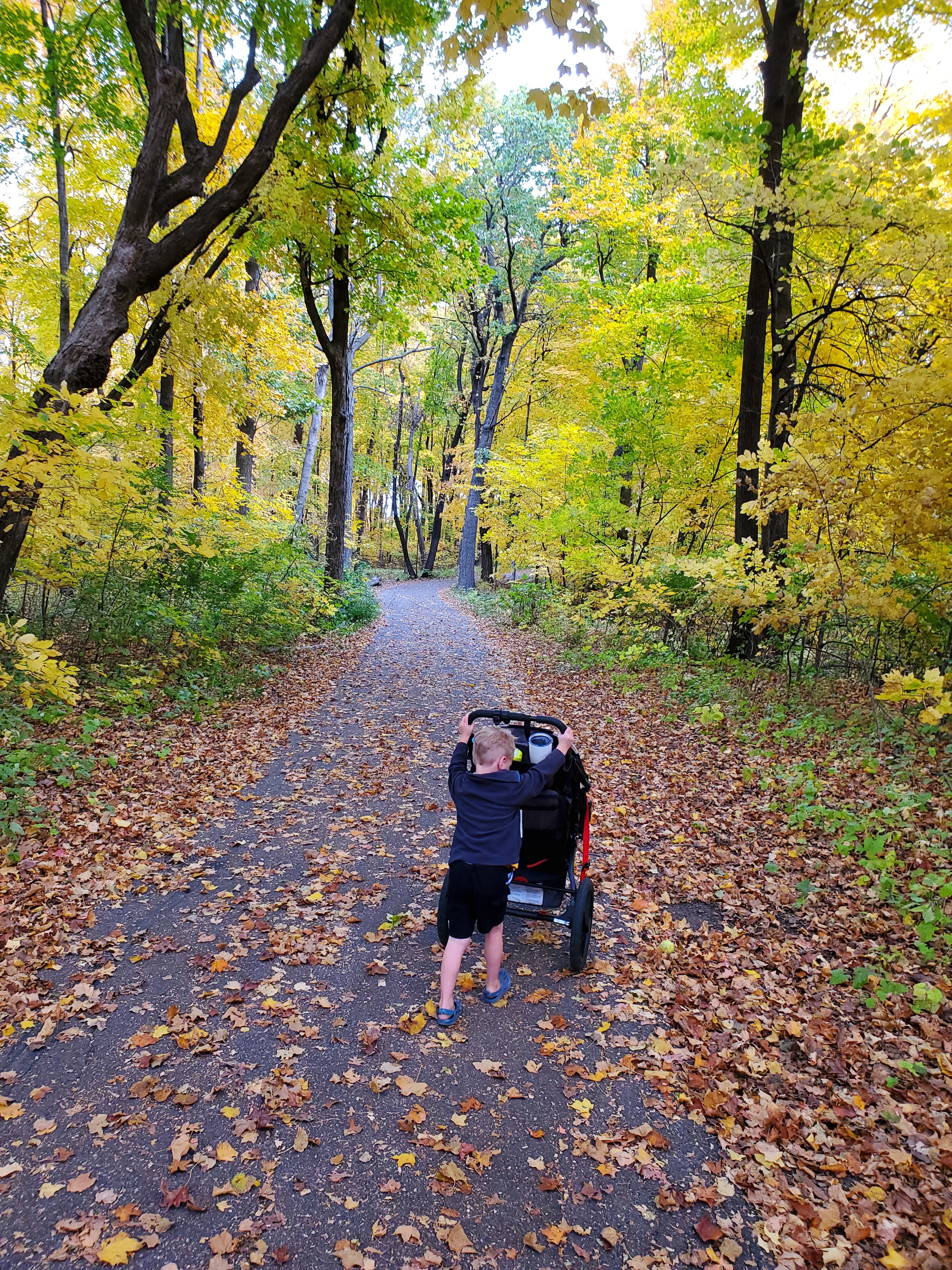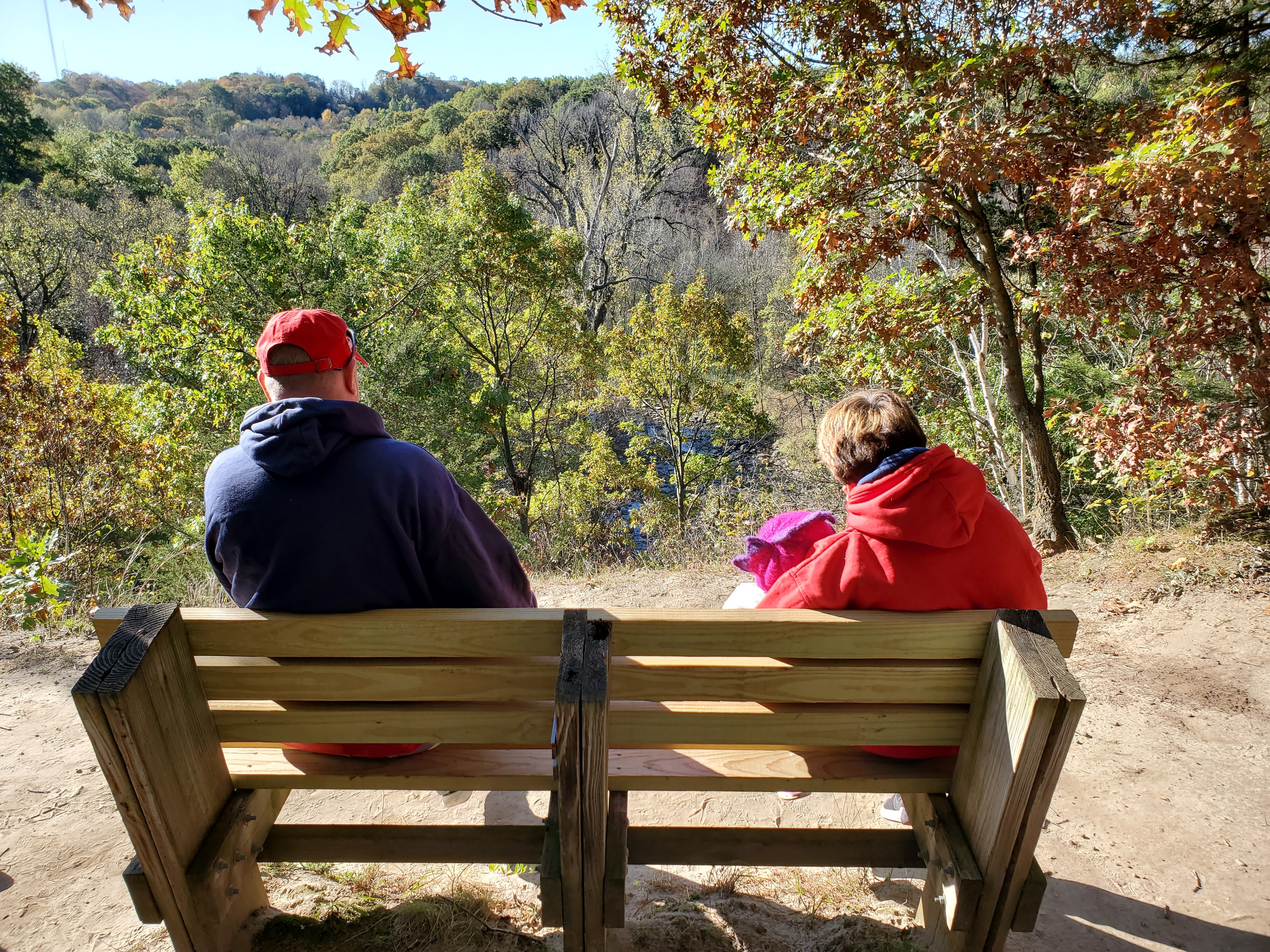 - Bluff Park in North Mankato- This is one of our absolute favorites. We hike it every season and we have yet to ever be disappointed. It’s stunning in all seasons and weather. Tucked away in the middle of a neighborhood, you would have no idea the beauty this path holds. Starting off the hike, you walk through a beautiful forest setting. In the fall, leaves fall endlessly around you and you can hear the crisp sound of your steps. After a short distance, the path opens up to a wide open prairie with a circular path. On this path, you can enjoy the sun shining down on you while being surrounded by a circle of trees. At one point, there is an overlook that shows you the stunning bluffs all around Mankato and Hinniker Pond below you. My favorite part about this trail…it’s fully accessible for all. Anyone can enjoy this beauty, as the path is completely paved and mostly flat. There are benches throughout the hike and even a picnic table in a gazebo. It’s also, a fairly short hike…so short that all three of our kids usually can walk the whole thing with minimal help…and complaining. You won’t want to miss this gem!