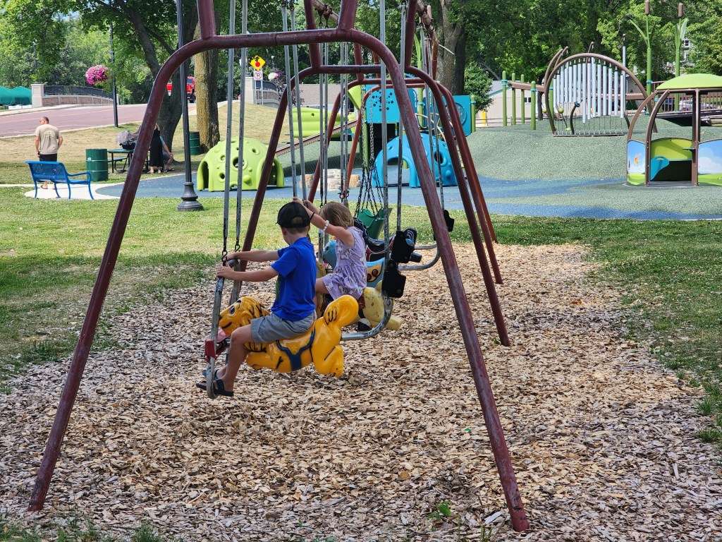 If you have never been to Fairmont, it’s a town you should visit! I’d compare it to a smaller scale of Wayzata, Minnesota with their lakes. Known as the “City of Lakes”, they have a chain of five lakes that are stunning. The city contains many airbnbs for this reason and has a smaller town feel, combined with a cabin feel. Nestled between two of the lakes lies a wonderful park that not only my kids love, but I do as well. Gomsrud Park boasts beautiful views of boats passing through both lakes and not one, but two wonderful parks. When a new park was built in this spot, the city left the other park in the same spot. My kid’s favorite part of both parks are some animal swings. Kids can push themselves on these older swings that look like animals. For some reason, all three kids get a kick out of these and spend a large majority of our time swinging while here. The older part of the park also, contains a fun fake car that kids enjoy sitting in and pretending to drive.