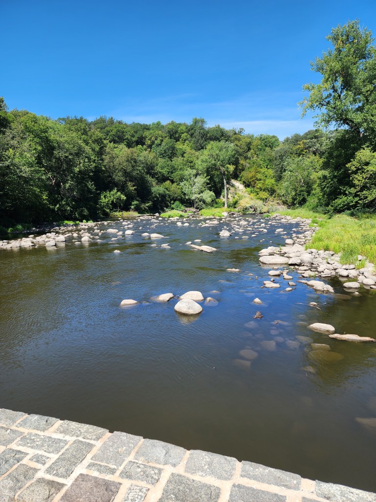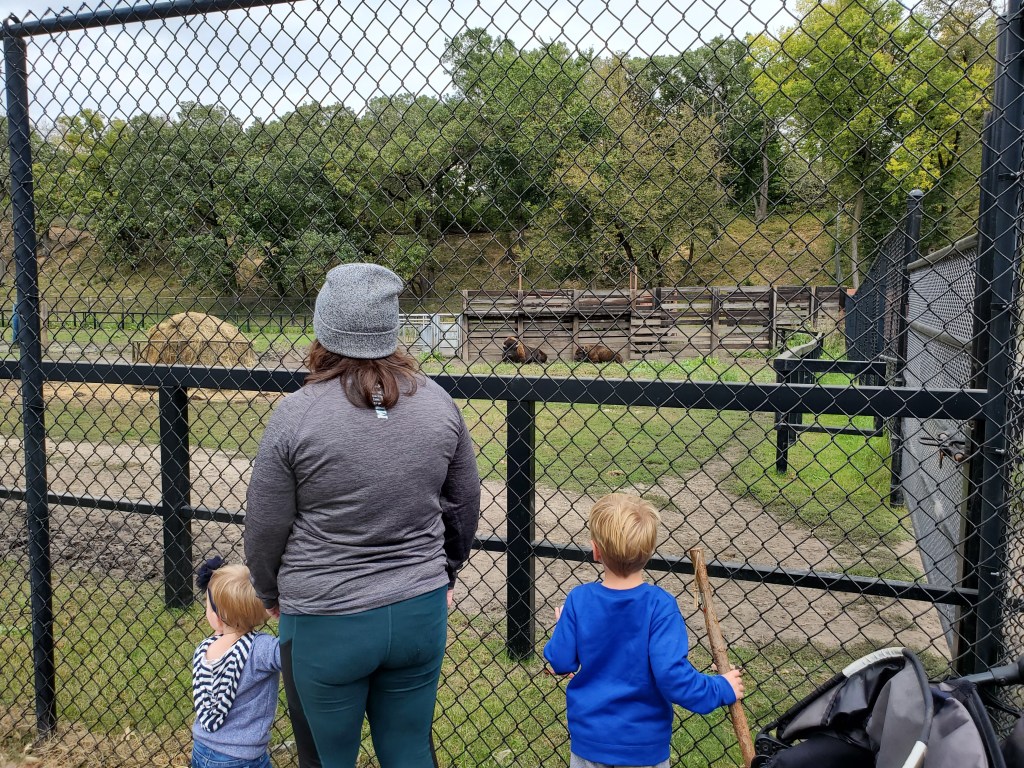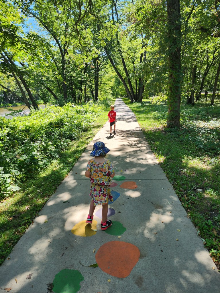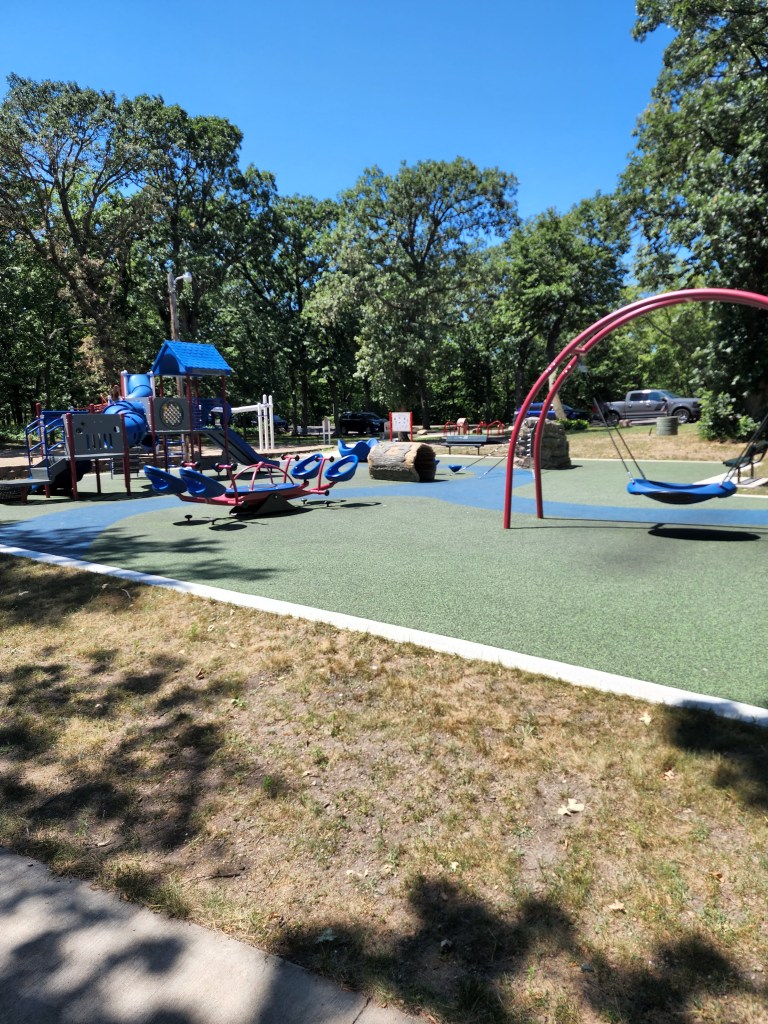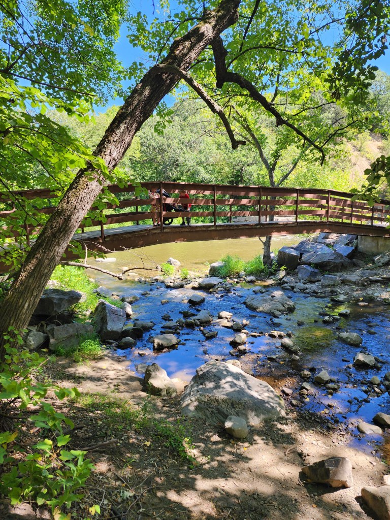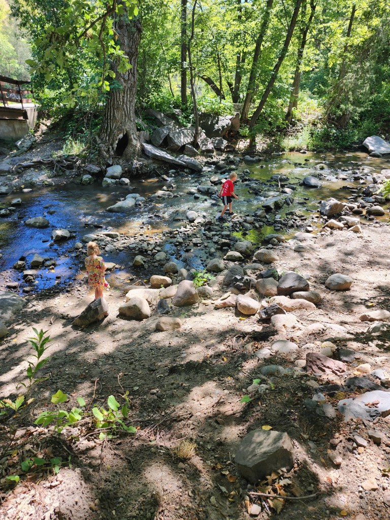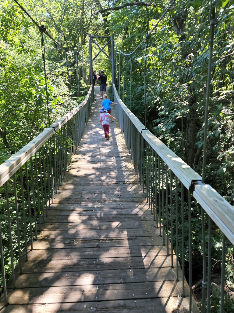 So, what does this park have to offer? Where should I start? There’s a tiny zoo with a few different kinds of animals, including elk and bison. Entering the park, there is a stunning stone bridge that you can walk or drive across with the river on both sides. Throughout the park, there are a wide assortment of different other kinds of bridges for you to walk across as well. That assortment does include a suspension bridge, which is not always my favorite, but I’ve faced my fears each visit. The waterfall itself also, has to be included in the list. An easy spot to hike to, but also accessible from two different parking lots. This was one trip that we were able to take with my dad when his mobility was limited. Most places within the park are very accessible with parking lots right beside all large attractions. It’s a very kid-friendly park as well. There are several spots in the river that have small areas of creek and lots of rock that are perfect for kids that love to jump on the rocks and explore the water. Definitely a favorite part for my son! Along a few of the walkways lie sensory paths, which distracts my kids from the hard part of hiking…walking. Last, the park has four different playgrounds. Our favorite playground is one of the ones at the top of the hill going down into the park. Not only does it have an older, original playground, but it also has a newer playground with a scavenger hunt that my kids love.