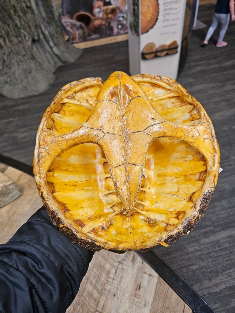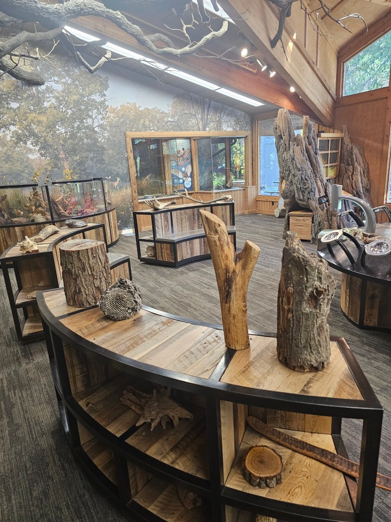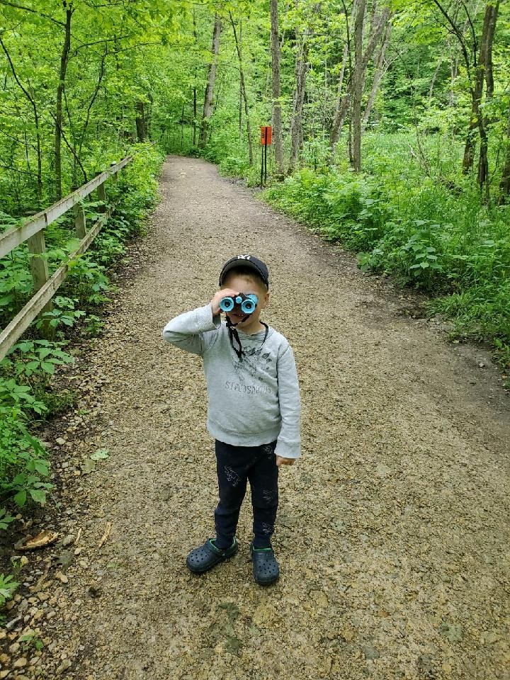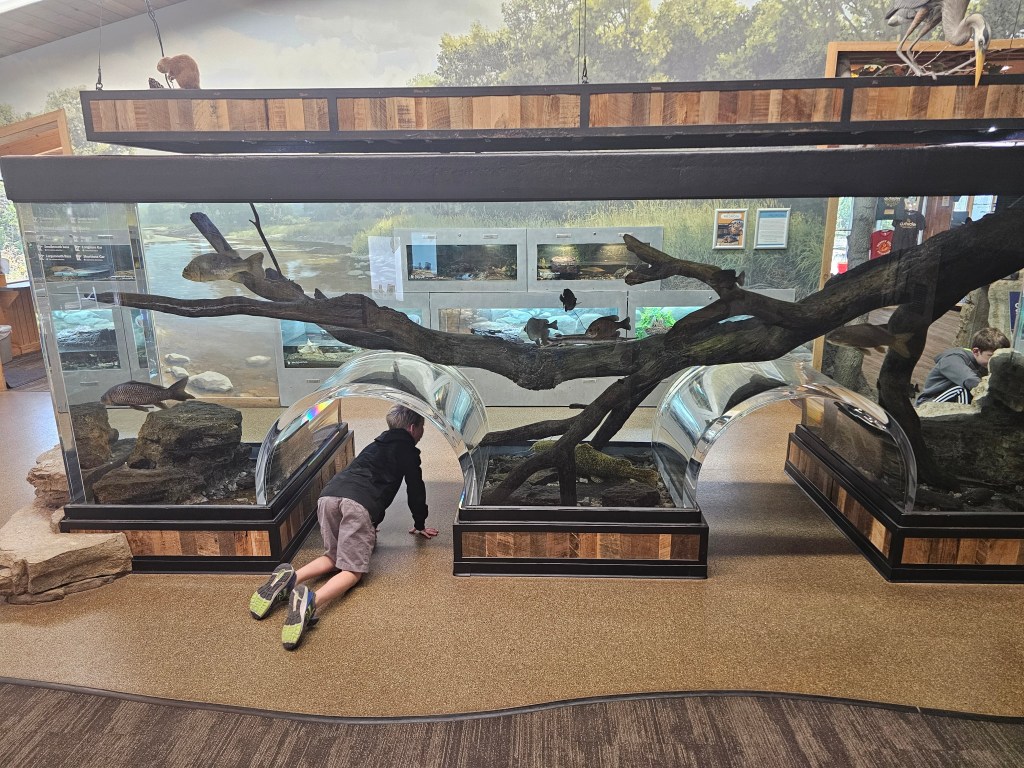 After we finished the guided hike, we visited the nature center. It was incredible! Definitely one of the best ones we’ve been to in the state. There were animals, hands-on activities, and so much to learn. Employees from the nature center were very knowledgeable and so kind with the many questions my kids showered at them. On our most recent trip, we again spent a large chunk of time here. Excited to see fall foliage, we set out on a hike and surprisingly found a lot of fossils this time. The views were beautiful and again, were very doable for our two year old now (different kid!) Since our last visit to the nature center, they had changed some things around. Now, there is a reading nook in a pretend tree that my girls adore. Many hands-on experiences are available to everyone who wants to feel or use a microscope and see up close details of different nature items. We did check out binoculars from the nature center for free to take on our hike. These are always a hit with our kids and definitely add an element of fun to an adventure.