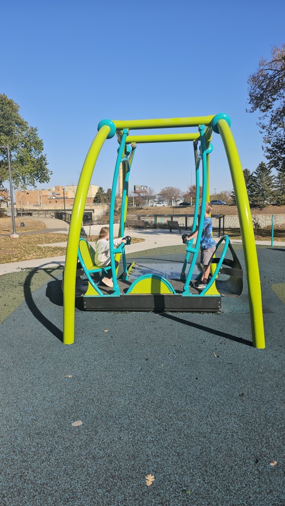 We’ve stopped at two different spots on our way to Rochester as I’m a firm believer that the journey is sometimes just as fun as the destination. One stop was in Waseca to stretch our legs and play at a fun park called Northeast Park. The kids loved the mix of playground equipment and especially, loved all the climbing equipment. It was also, a perfect spot for a picnic with lots of places to sit and still be able to watch the kids play.