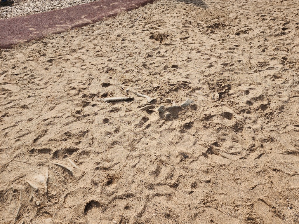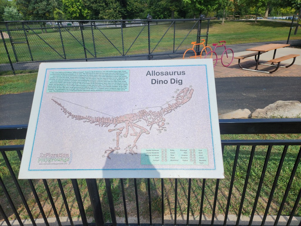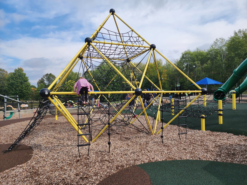 Back to the park, there are two ziplines. A small toddler area was perfect for my one year old and allowed her to explore independently, while staying safely in the play structure. Also, next to the toddler area was a large sand area. Within this area, there was an Allosaurus dino dig under the sand. My son would have loved this! Another fun part of the park was a multi-story playground. Once they got up past the first level, it was all contained. This is always a nice safety precaution for those very adventurous littles who are skilled at climbing. Yet another area of the park contained a large yellow climbing structure, with many nets and ladders. Besides all of these fun play features, there was also a metal climbing area in which kids could climb, balance, or rock back and forth.