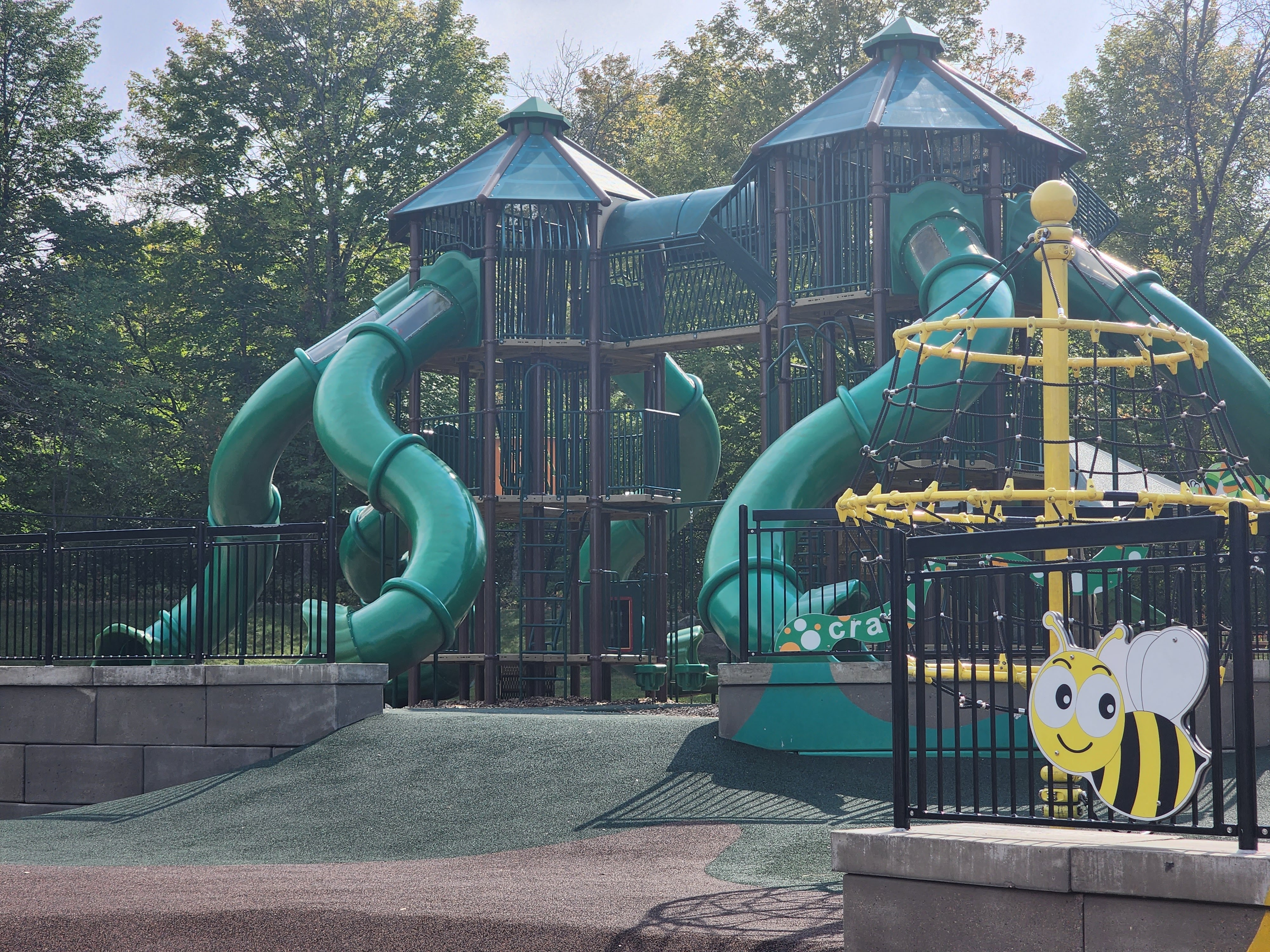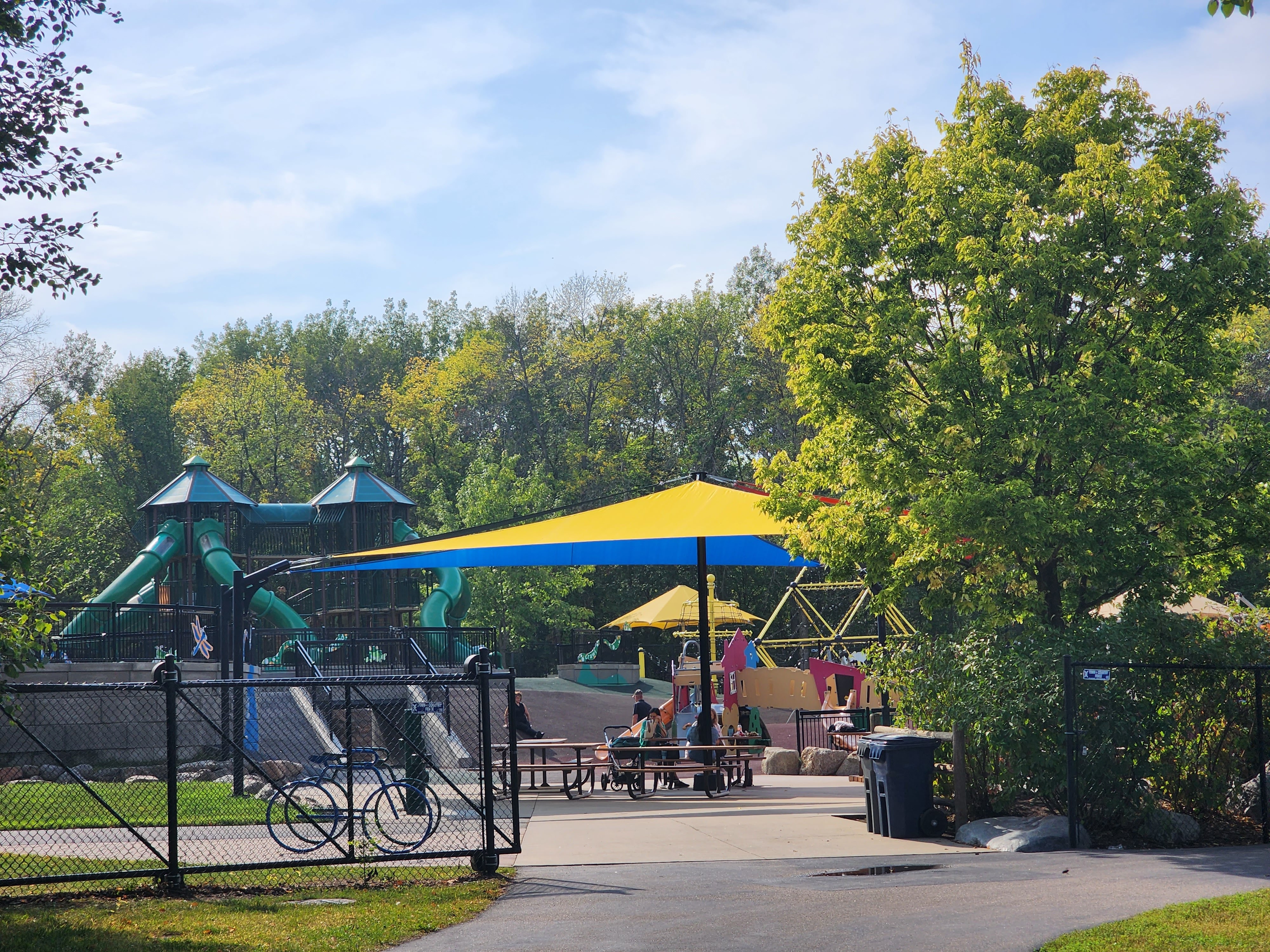 Last, there were some oval swings and a large boulder climbing area. The boulder provided an opportunity for kids to climb up into the playground as it was slightly lower than most of the other play features. There were many areas to picnic here, as well as some areas that were covered with large umbrellas. Another added bonus was inside individual bathrooms. We spent a while playing here, as well as taking a visit to Eastman nature center and hiking a little bit. After we finished playing, we did make a stop at Honey & Mackies for a wonderful flight of ice cream in Plymouth. Highly recommend this fun location as well! Overall, this is a definite must-visit park that is enjoyable for all ages and skill levels. Plan your visit there today!