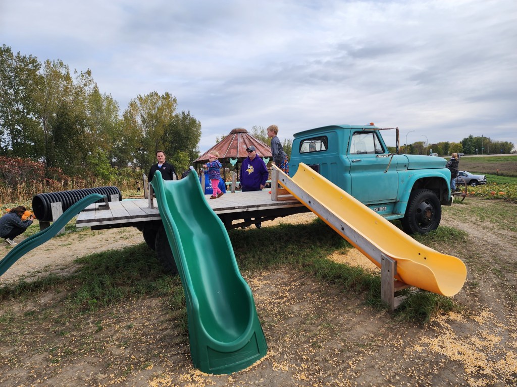 On the weekend we visited, they had a food truck with delicious cinnamon mini donuts. They were affordably priced for $6 for a bag of mini donuts. Activities include: a small corn pit, a straw bale maze, a truck with several slides down it, and some games. Several cute photo opportunities are sprinkled throughout the patch, allowing you to remember your visit. We always make a point to stop at this pumpkin patch each year as it’s fun, a great size place for little ones, and conveniently located. Also, the pumpkins are beautiful and there is a wide assortment. There is a port-a-potty on site and plenty of parking.