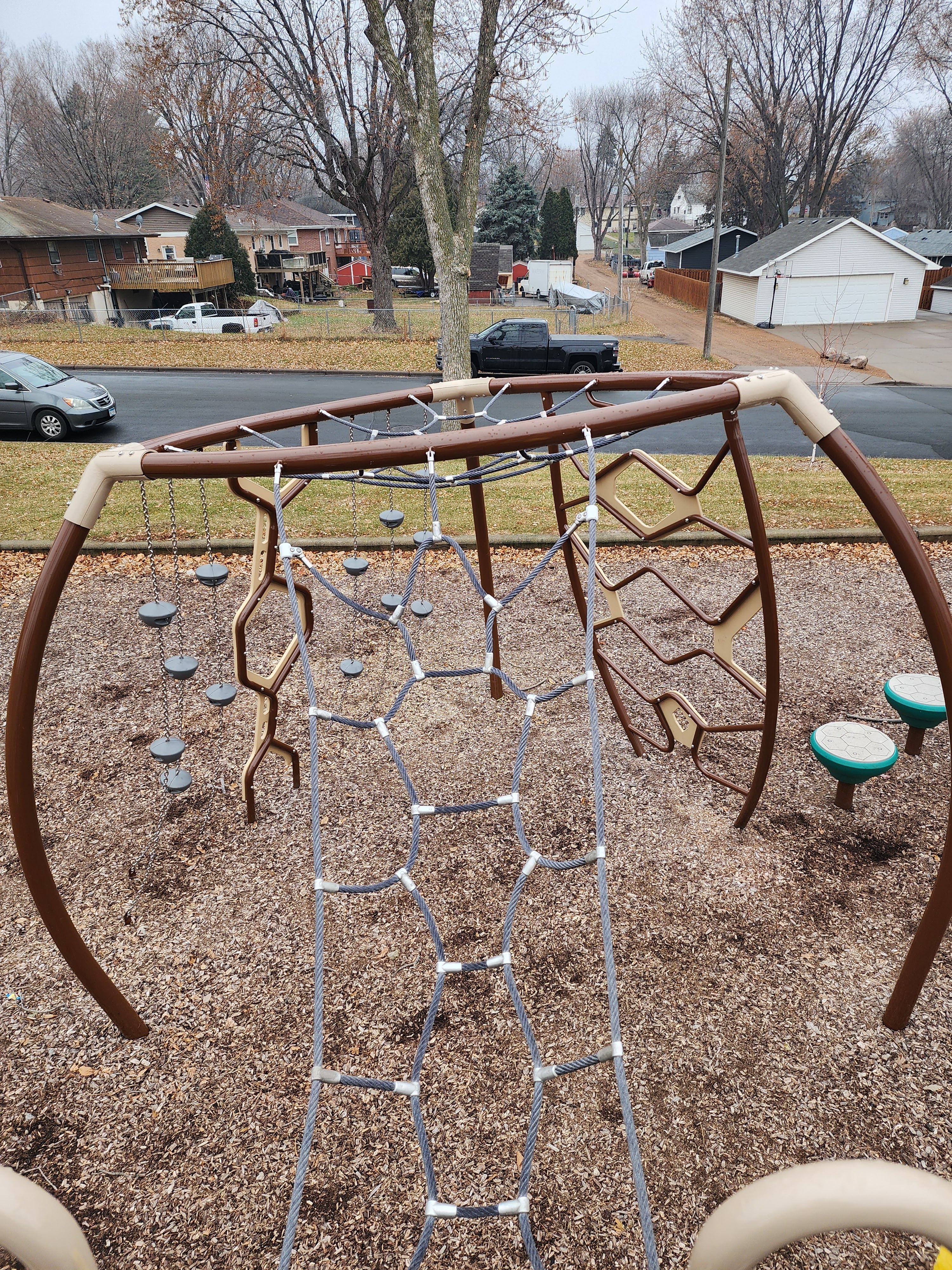 Next, we headed to Hiawatha Park. Tucked into a neighborhood, I had seen pictures of this park and thought my two oldest kids would enjoy. This is definitely a big kid park as everything is accessible mostly by climbing. Although, our almost five year old could do most of it and enjoyed the challenge. Walking up to the park, my son was slightly creeped out by some old clown swings that were still here. He quickly forgot about those as he jumped on the playground. As they climbed, I couldn’t resist and had to get in on the fun at this park. Swings, a basketball court, and a gazebo for picnics were all at Hiawatha.