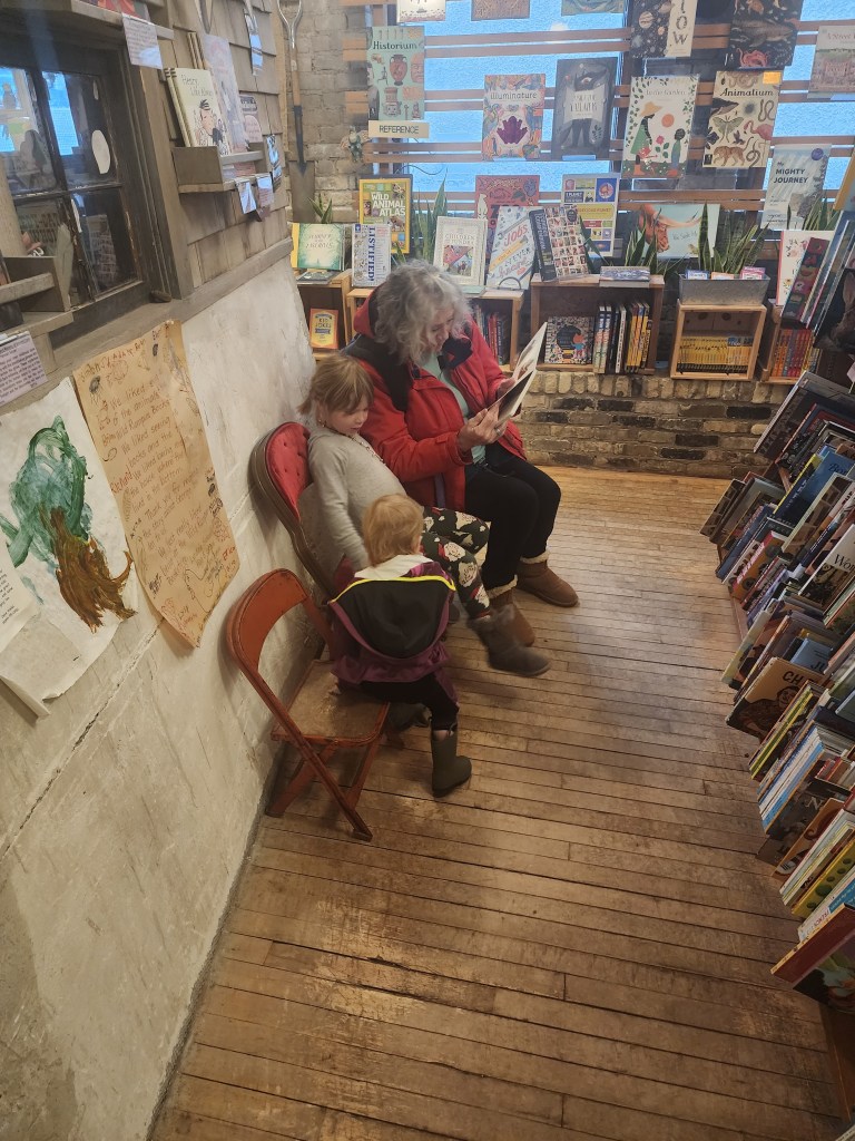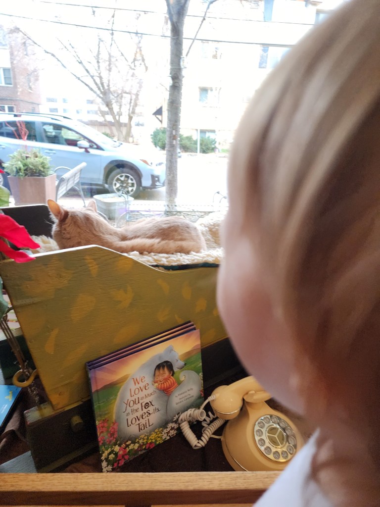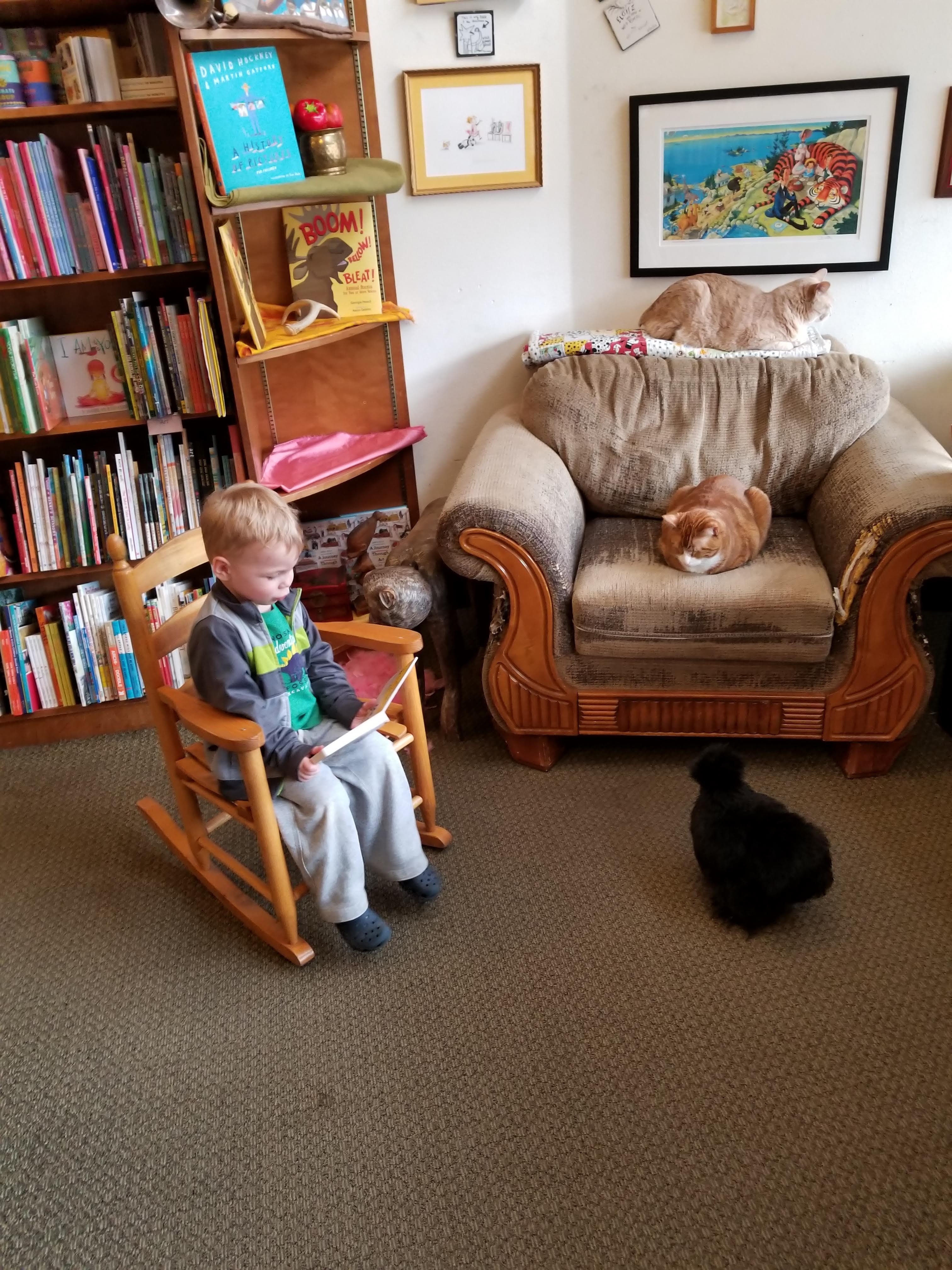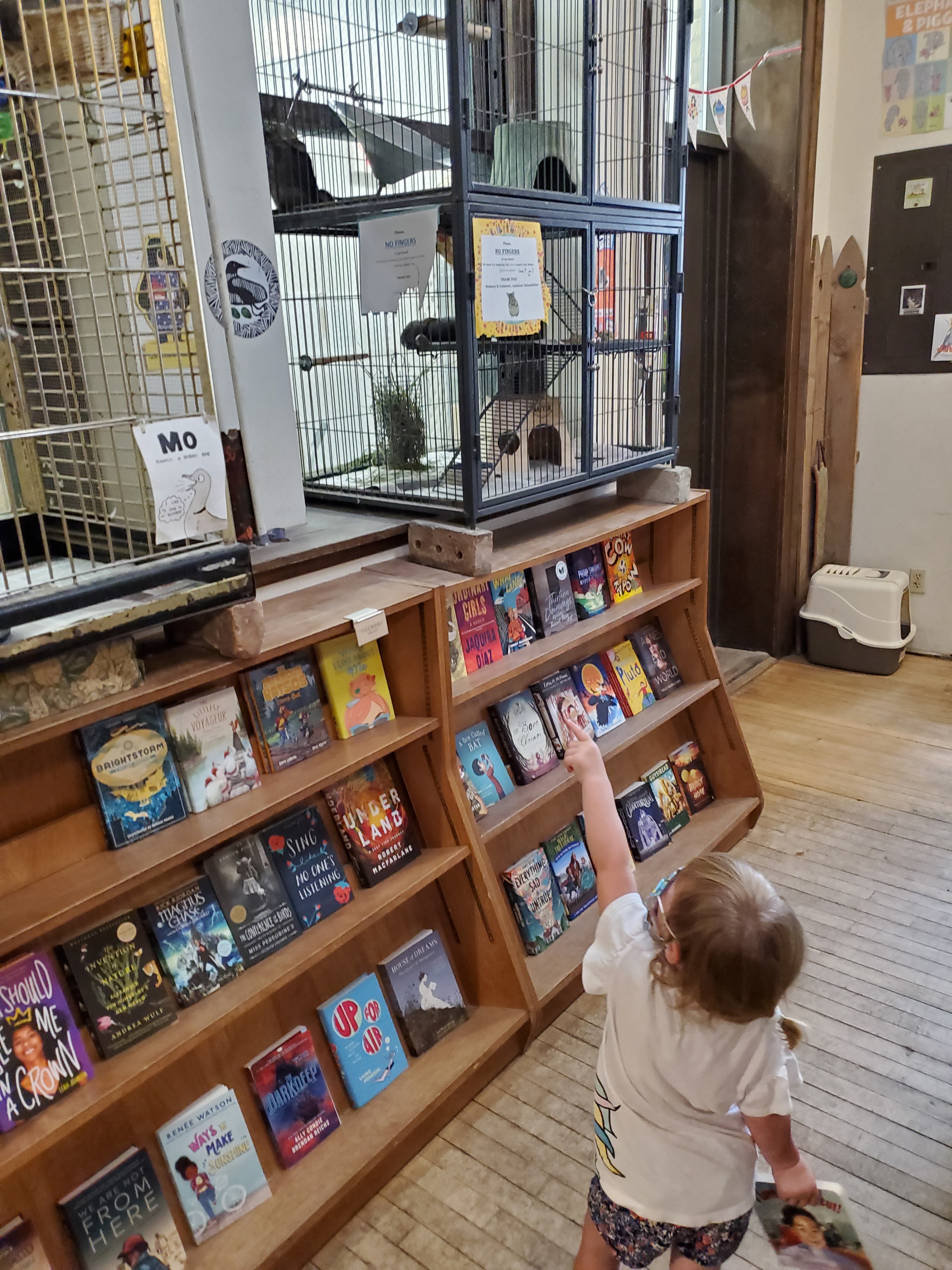 Wait, there’s two more reasons why we love this store. Did you know they have animals? Cats roam free around the store and sometimes, cozy up next to you as you look at the books. Near the back of the store, there are birds and chinchillas to see. Below your feet in one area of the book store (in a cage) is a rat. There used to be a sweet chicken who wandered around the store. I have so many pictures of my son reading to the chicken as a toddler. Of course, my last reason for loving Wild Rumpus is the wide assortment of books. From classics to brand new books, they have it all! The staff are incredibly knowledgeable and so helpful in making sure you find what you’re looking for. It truly is a special book store and worth the experience!