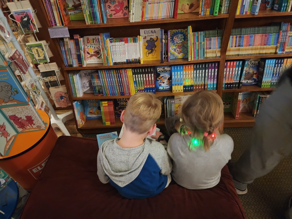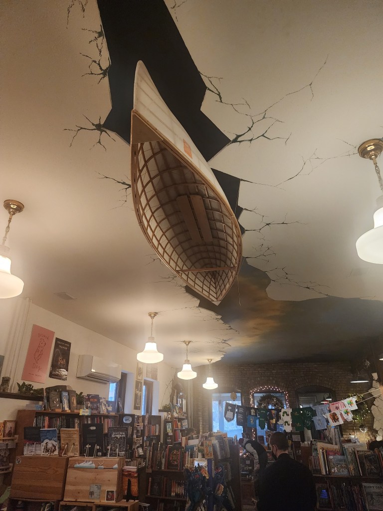 So many unique details set Wild Rumpus apart from other bookstores. First of all, there’s a canoe on the ceiling. Yep, you read that right. Second, there are nooks and crannies scattered throughout the store of comfy spots for anyone to cozy up and look at a book. From rocking chairs to log chairs to couches and plump chairs, there is space for everyone. Third, everything is decorated in a way to make little (and big) minds think. Take one look at their bathroom which has an aquarium for a mirror and hundreds of authors who have signed the wall.