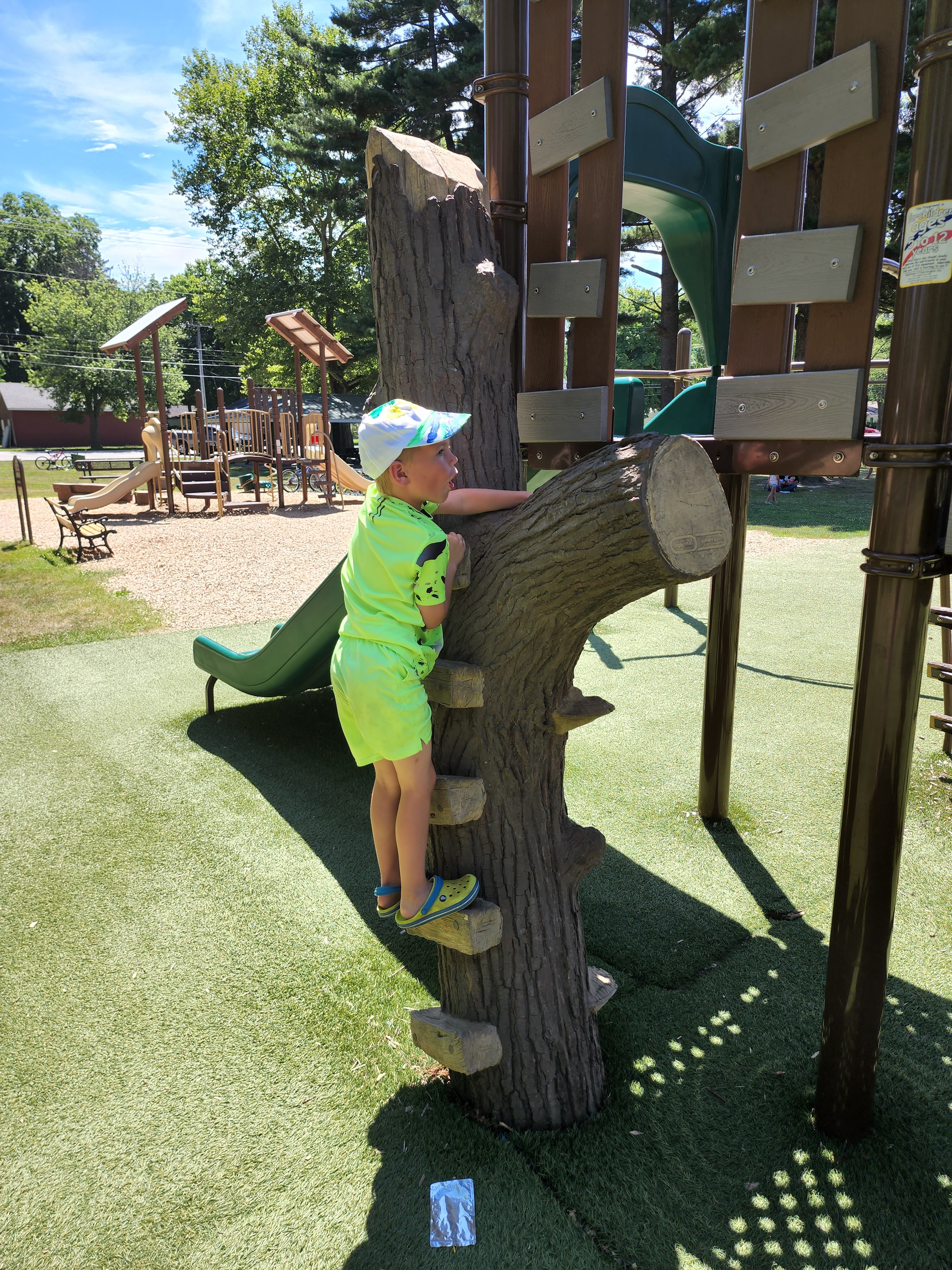Our first stop was Chesterton Park in Chesterton, Indiana. The kids loved the mix of nature-based playground equipment and equipment that looked like a park. Several unique climbing fixtures kept the kids enthralled for awhile. This park also, had a lot of green space which was great for some snacks and time for our youngest to enjoy being out of her car seat. When we stopped, there was a summer camp going on in the park with a lot of kids. My kids loved that there were many kids to play with.