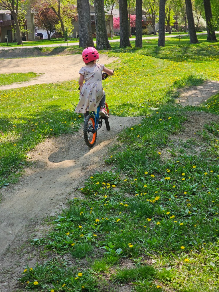 Let’s talk about pump tracks. What are they? A pump track is a track built purposely for bike riders to use their momentum to ride, rather than pedaling or pushing very much. They have curved turns, several small hills in a row, and sometimes logs, bridges, or wooden features to attempt tricks on. Sounds pretty cool, right? No special bike or equipment is needed, unless you want a mountain bike. Otherwise, we just used our normal bikes, a strider bike for the youngest, and normal bike helmets.
