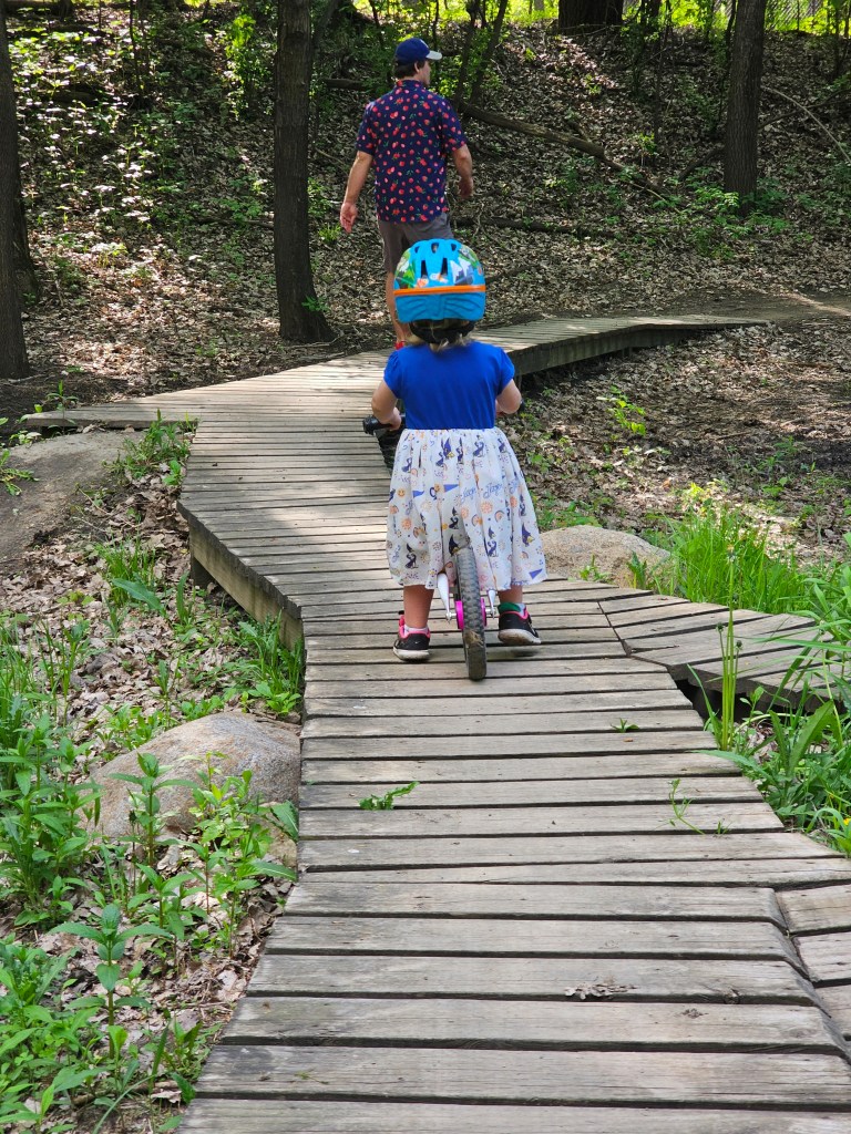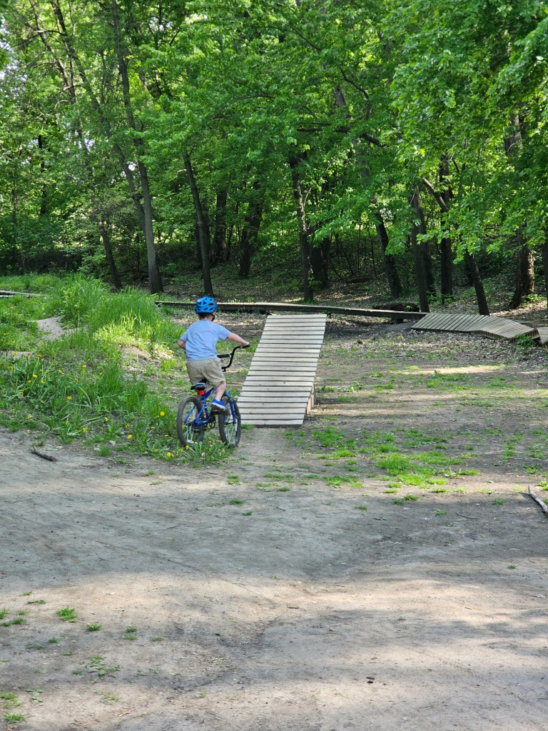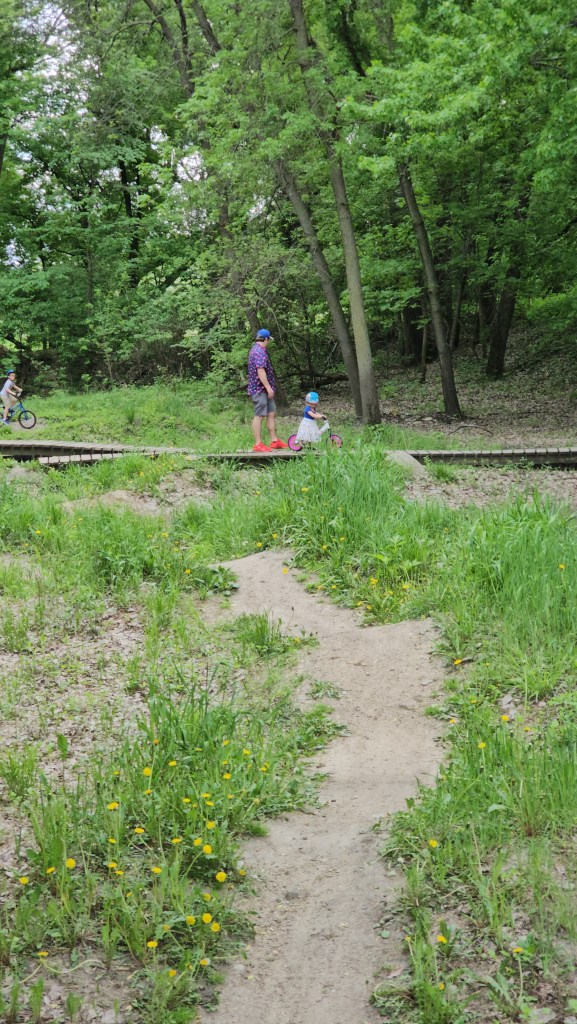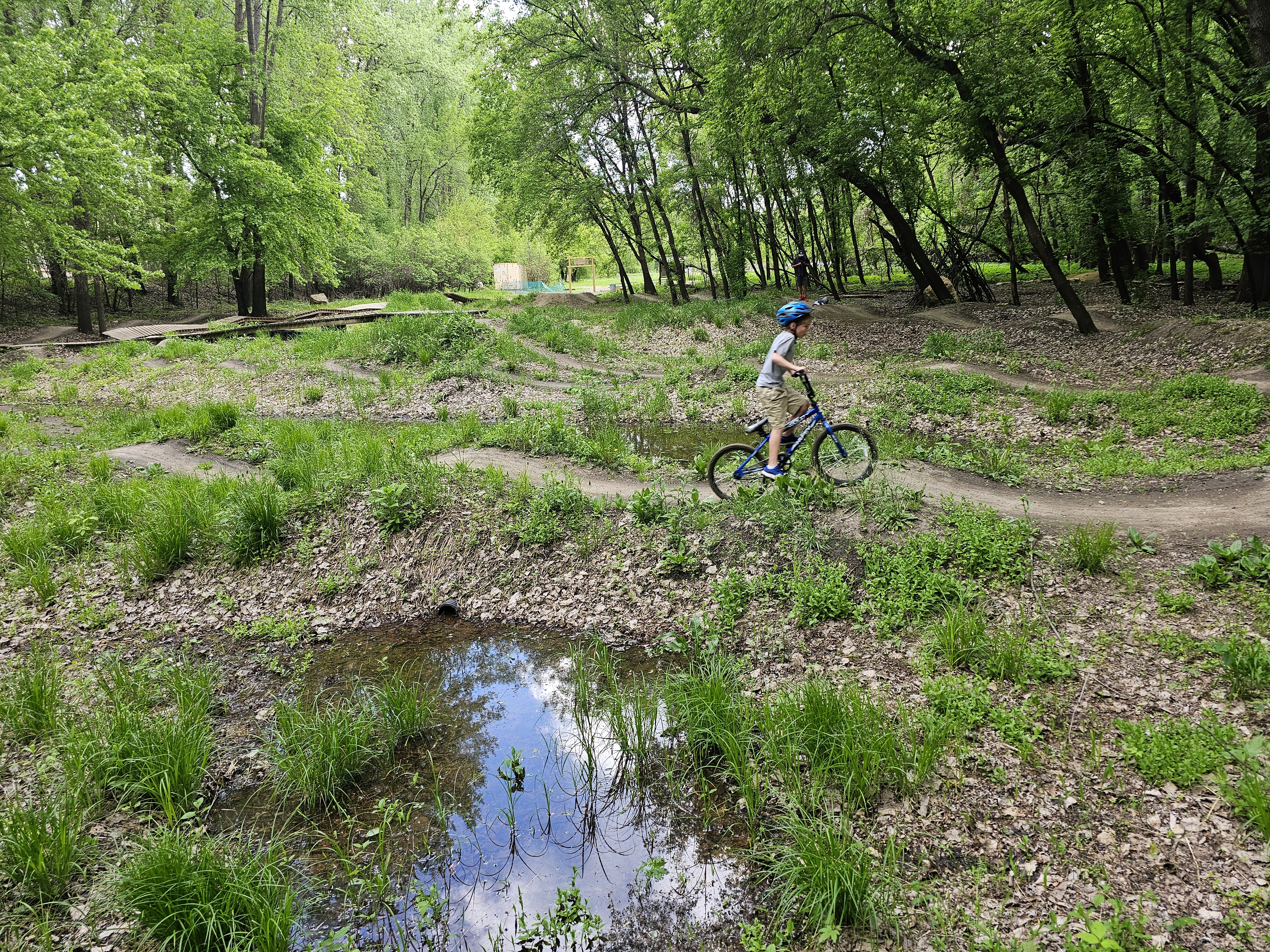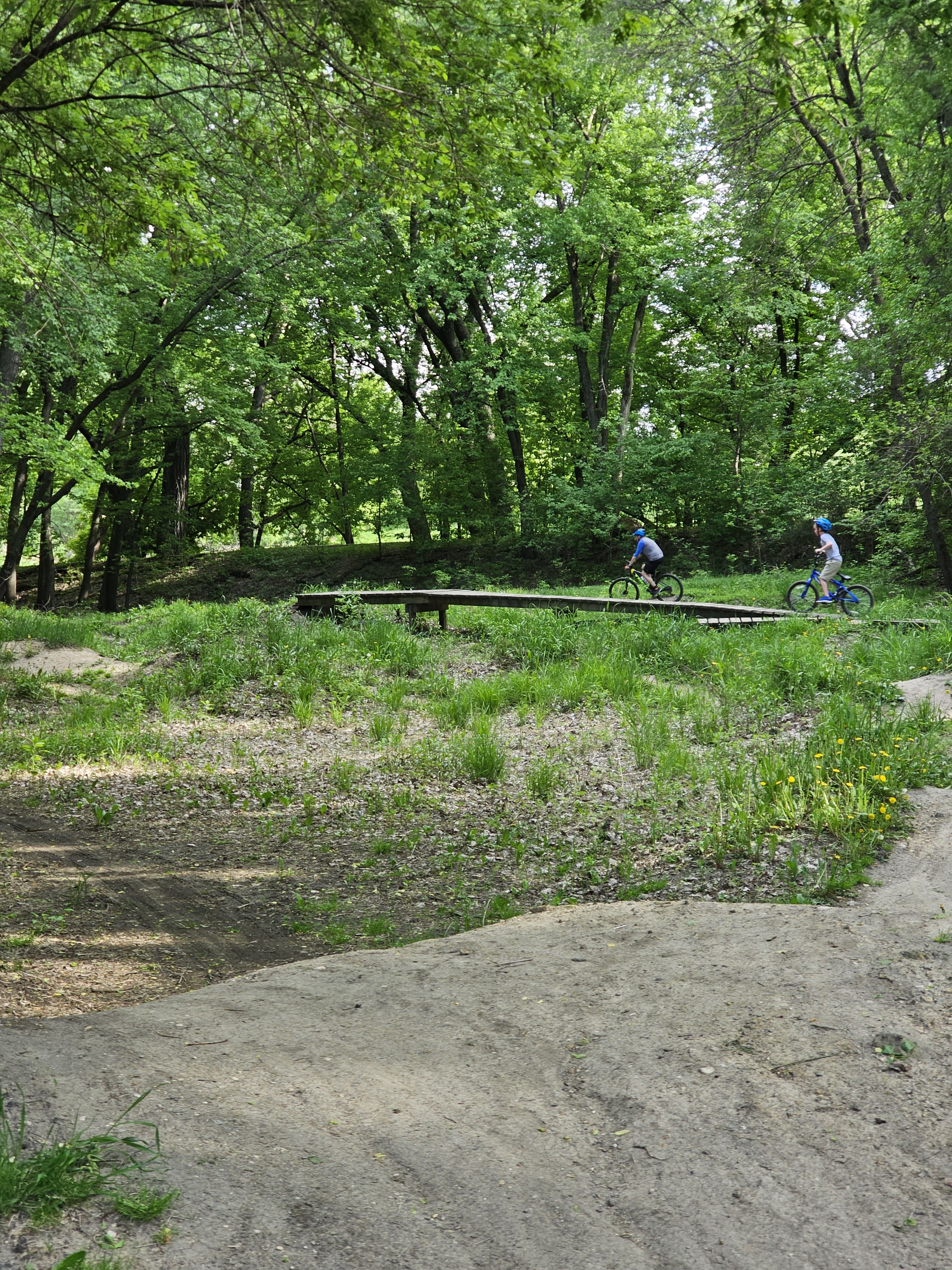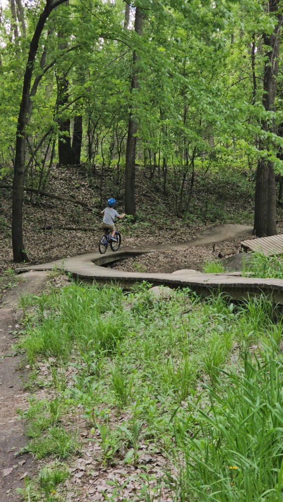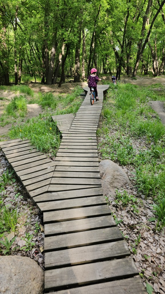 Since our kids couldn’t stop talking about Lion’s Park, we decided to try out another spot and let them ride again. Wow! This place is legit another hidden gem that we are so lucky to have in this region. Completely run by volunteers, this location not only has a skills park/kid’s trail, but it has several mountain biking trails complete with an assortment of obstacles throughout. All challenges have a way around them for those bikers who are not comfortable trying the trick. We came for the skills park that a friend had recommended to me. One thing to note is this location is right off the Minnesota River and is in a flood plain. Check Facebook prior to venturing to the spot if there is any concern about flooding or mud. Riding through mud makes the volunteers work harder and wrecks the trails, so it’s important to follow their rules for the upkeep of the park and respect those who help.