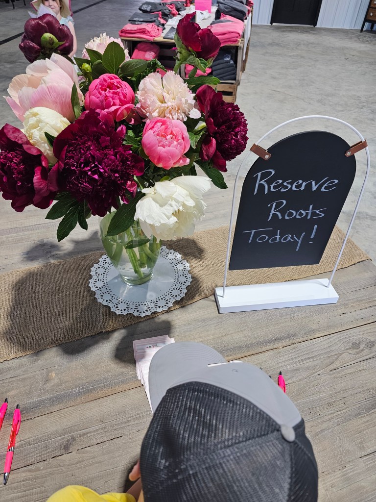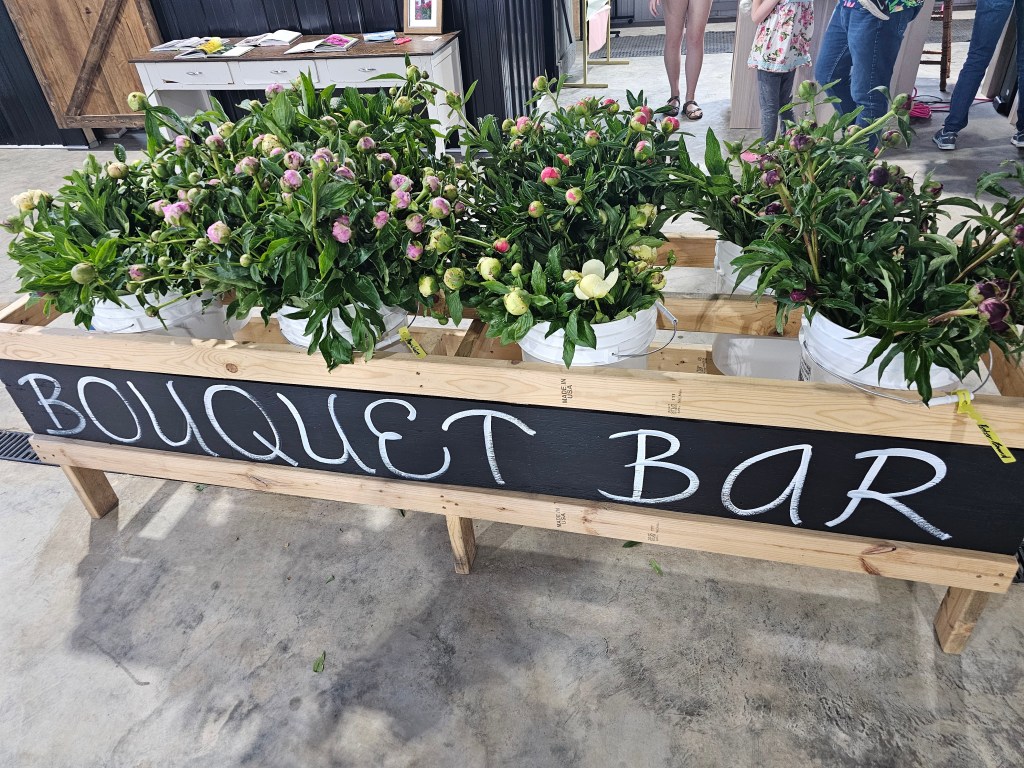 Besides the vases of all the different kinds of peonies, there was also merchandise and a bouquet bar. For the bouquet bar, you are free to pick stems for your own bouquet in different colors. Each stem is $4. There are also, pre-made bouquets with five or ten stems. Five stems are $20 and ten stems are $40. My middle daughter was absolutely ecstatic when we said we could buy a bouquet. She truly is a flower girl and loves getting bouquets. Another thing that can be purchased here are peony roots. These would need to be picked up in the fall, but you can pick your variety when you visit the farm.