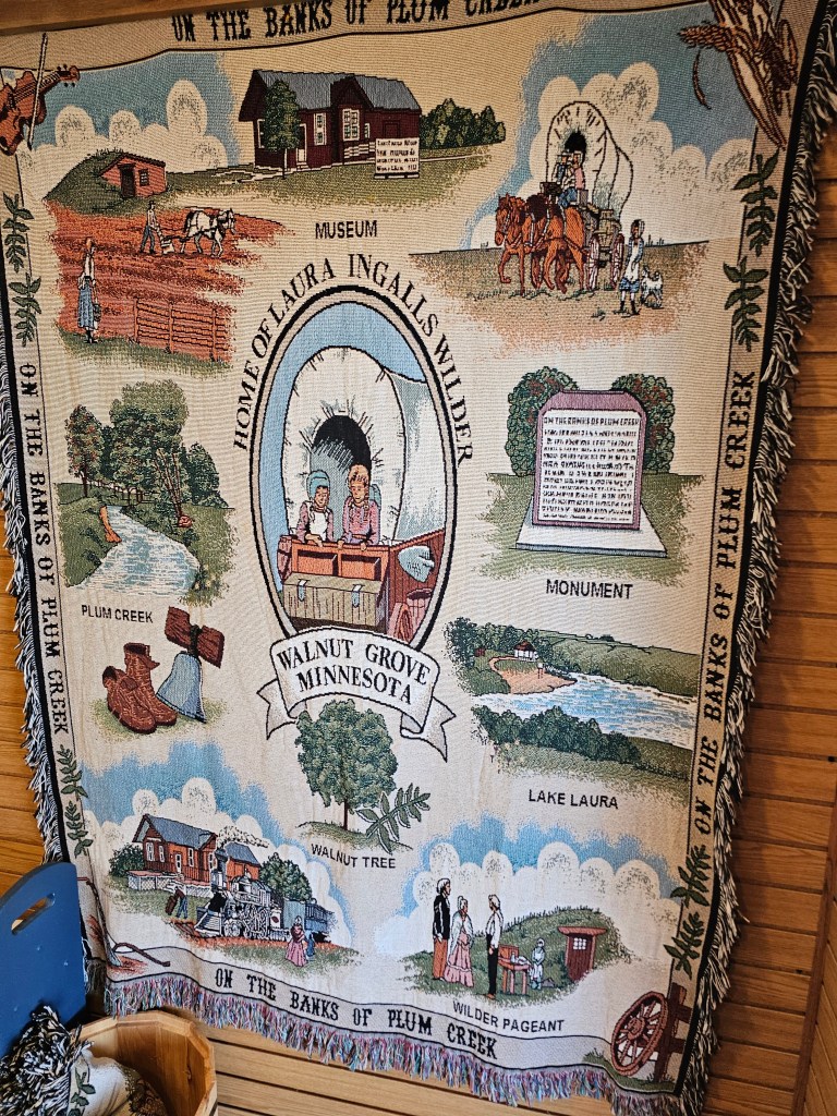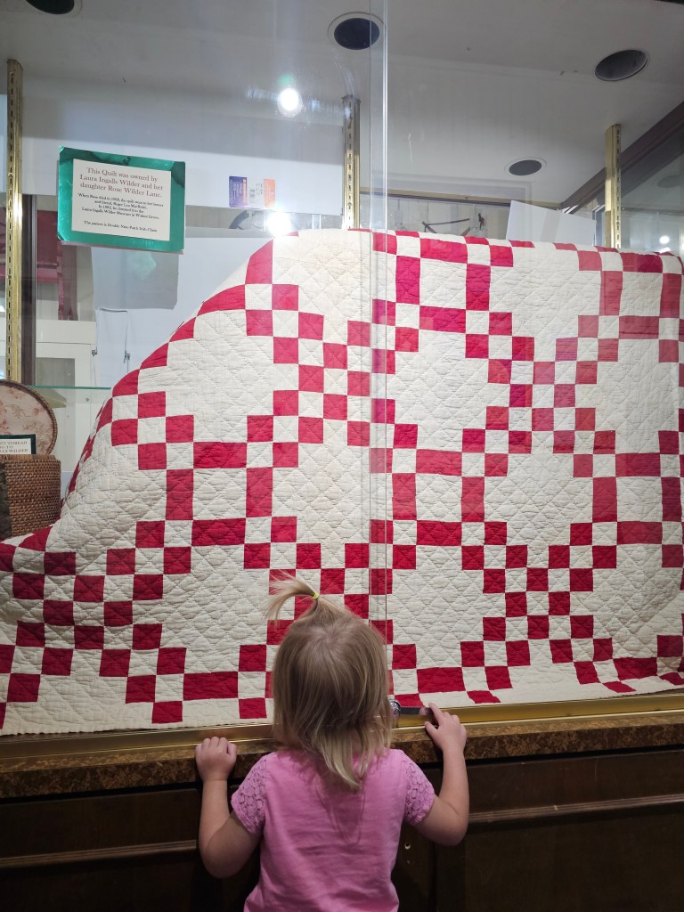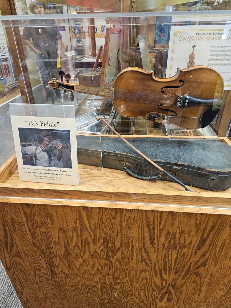 After the gift shop and buying our admission, we headed on the self-guided tour. The first building consists of lots of things from Laura Ingall’s Wilder’s past and things that were included in the book. Our favorites were the sled from the story about Grandpa and the pig and Laura Ingalls Wilder’s quilt. In the next room was Pa’s fiddle and memorabilia from the TV show of the Little House on the Prairie. They even had the show playing.