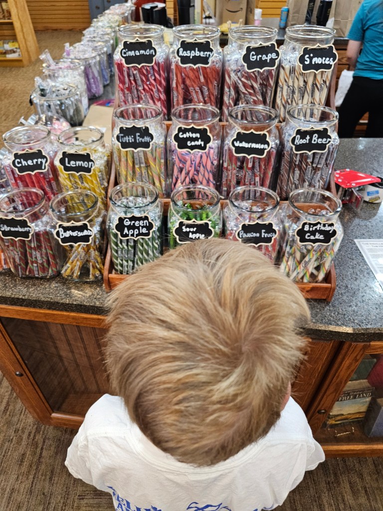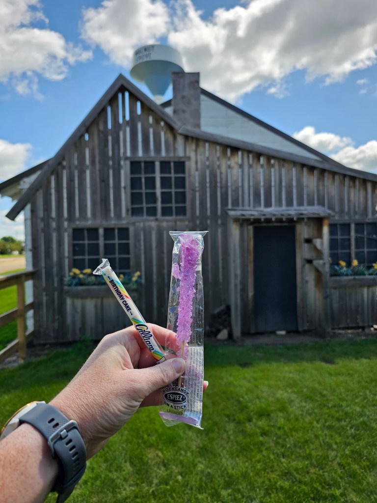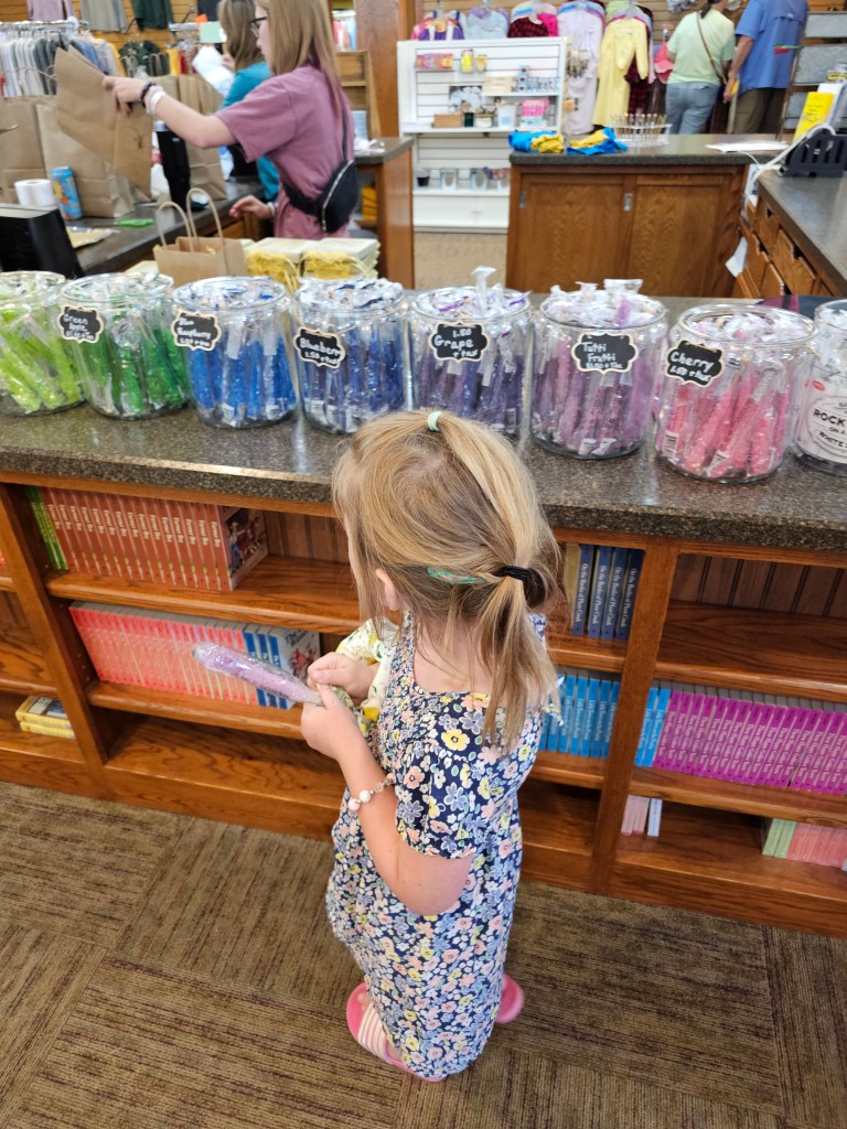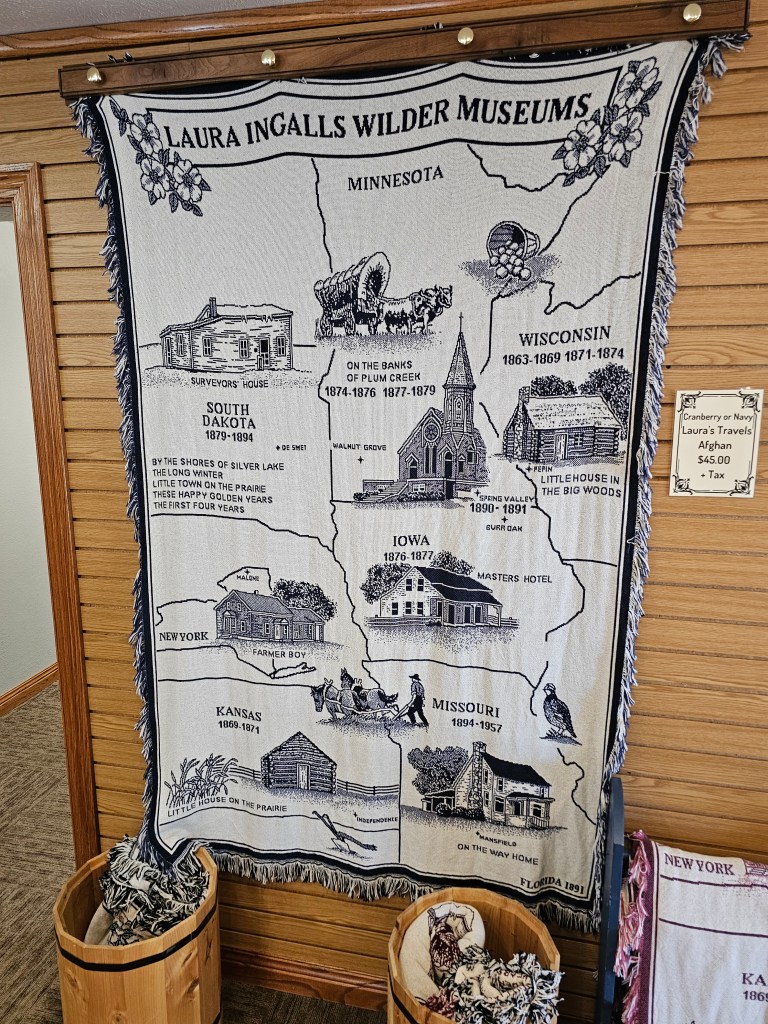 Walking up to the Laura Ingalls Wilder Museum, it’s engaging right from the start with a covered wagon that you can climb in and with cut-outs of people for pictures. The first stop in the museum is the gift shop and where you purchase your admission. Whether you stop to look in the gift shop before or after your self-guided tour, it’s worth the time! A wide variety of things are available for purchase from the book series to bonnets and dresses to souvenirs such as cups, mugs, and blankets. We bought a hand-quilted piece to use as an ornament on our Christmas tree to remember our time at the museum. Our kids loved seeing the pencils (made out of bark), games that kids might have played with in that time frame (think jacks and ball in cup), and the candy they talk about in the books. Each kid bought their own rock candy to enjoy.
