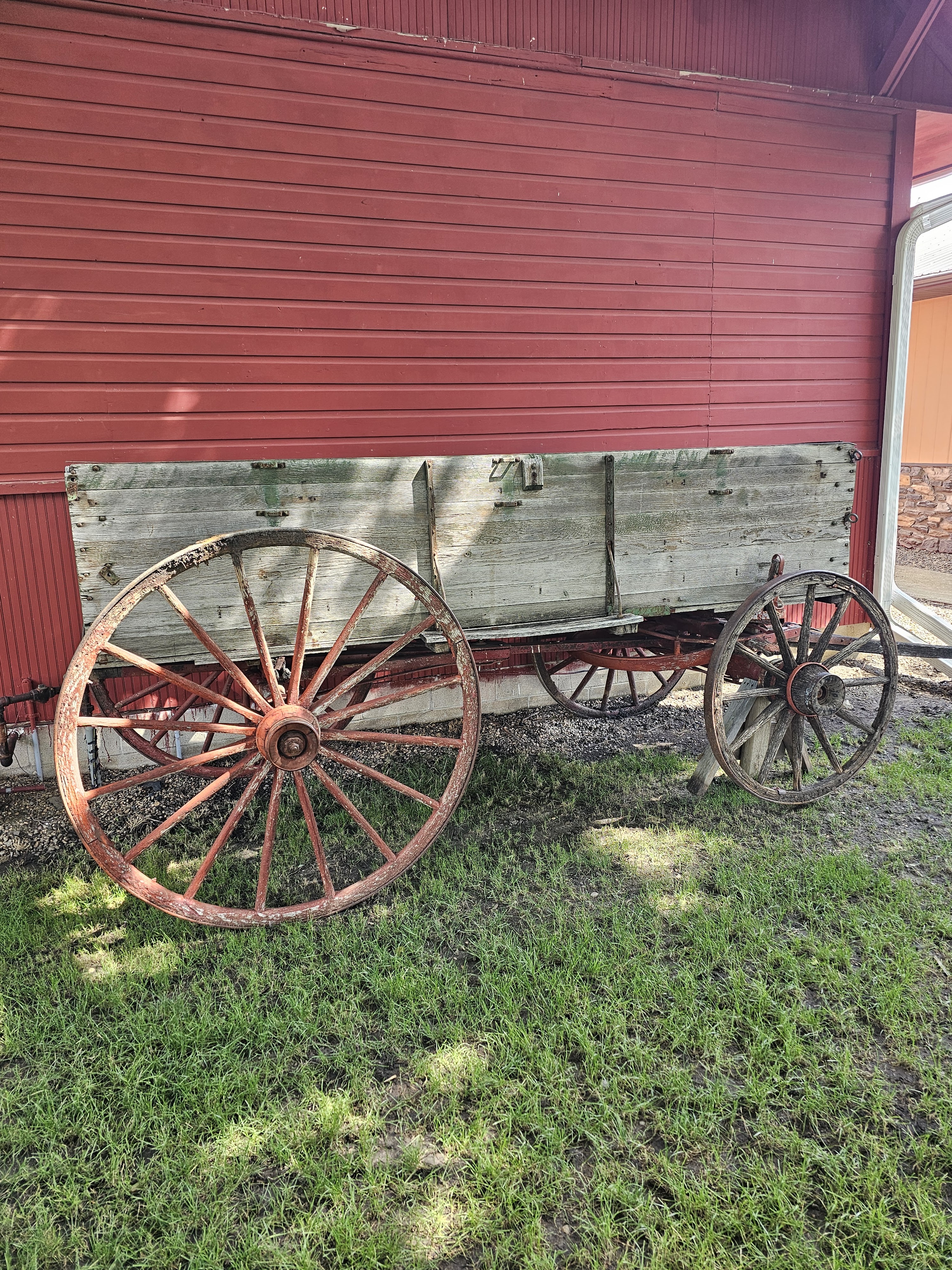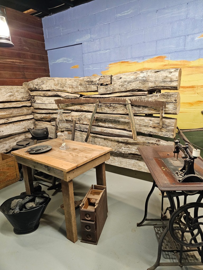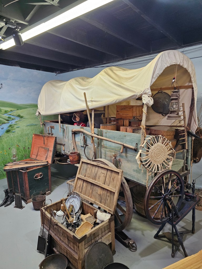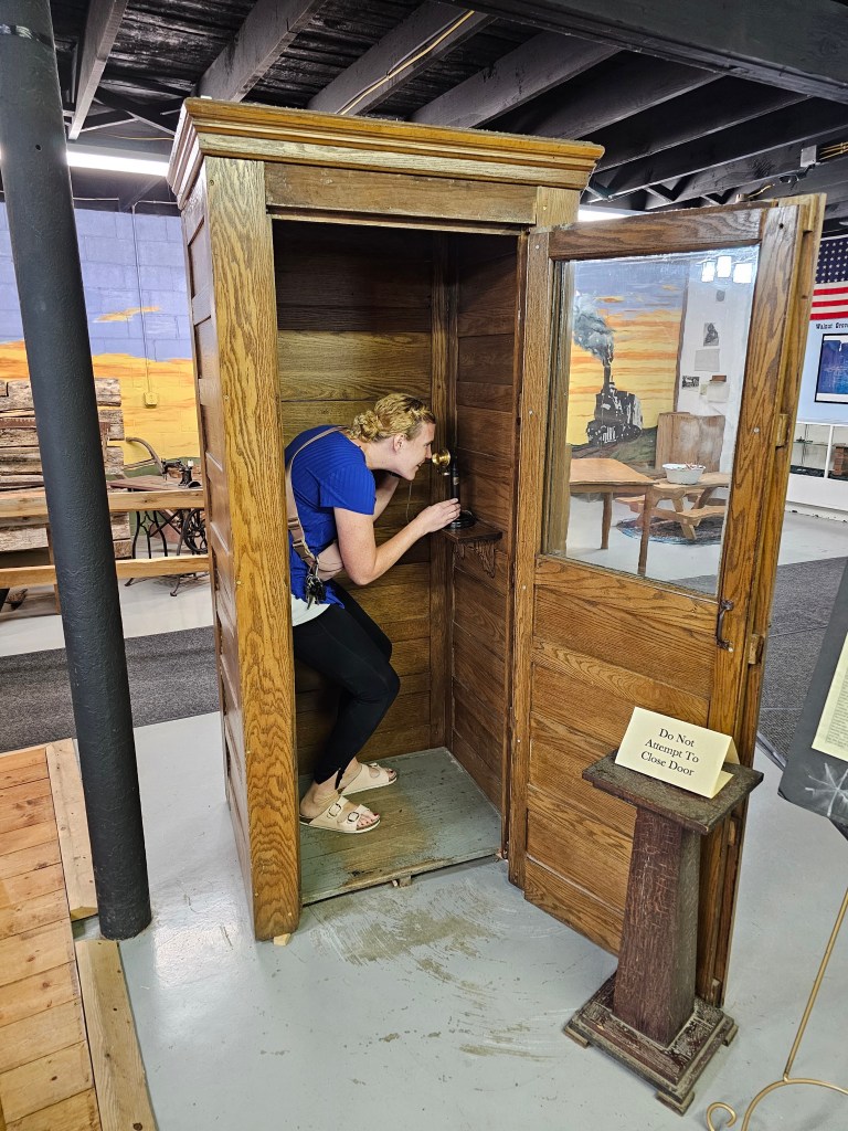 Next was the schoolhouse. The kids were bewildered at how a one-room schoolhouse worked. Many questions and lots of learning happened in this space. Naturally, everyone took a turn finding a desk that fit themselves and listening to Daddy teach! Next were two different spaces that showed us a little more about what life was like during this time period. One area had a full house set up and the other area had many parts of town set up. These included a store, a railroad station, a post office, a newspaper, a phone booth, and what a covered wagon looked like when it was all packed up for a move. This was wild because we had never thought about all the things they had to bring and fit into this small covered wagon with a large family too. My kids loved the interactive pieces such as Lincoln logs to build with and the store to actually play and shop in. While the kids played, there was lots of information that could be read by the adults or kids who can read too.