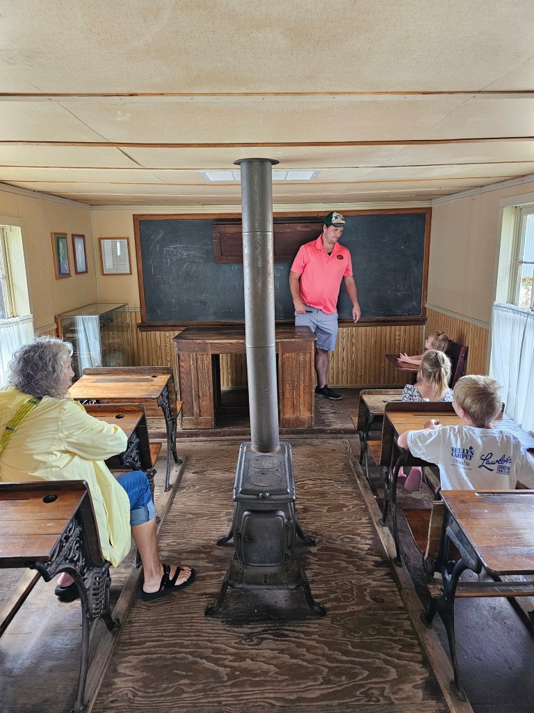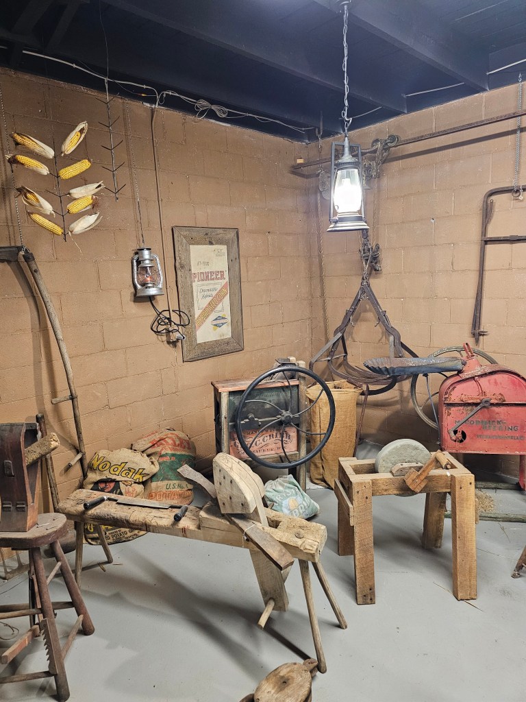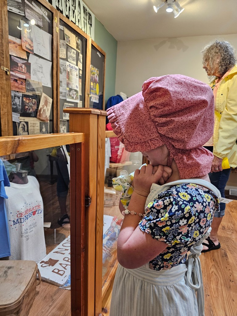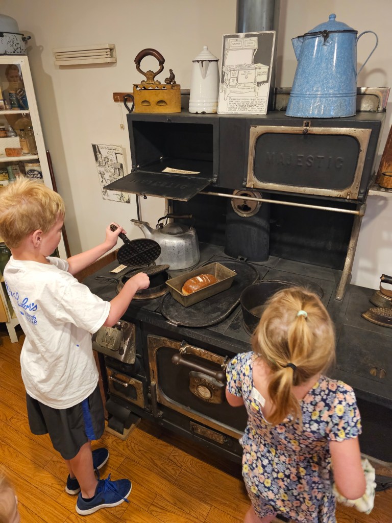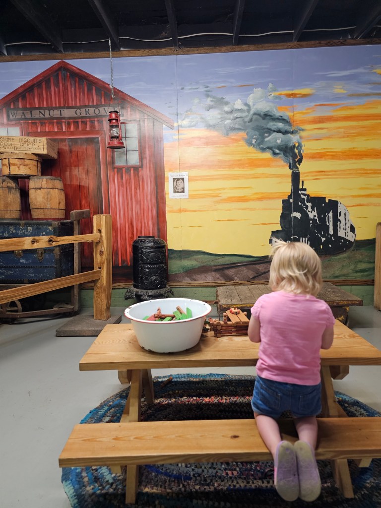 Next, we headed to Grandma’s house. In this spot, there were many things on display that they had used during that time frame. The kids were shocked at what washing machines, ovens, phones, and butter churners actually looked like. My girls loved trying on the bonnets and aprons to see what their normal outfit would consist of. Much to their surprise, they were ecstatic to find that Grandma’s attic contained a play area for them. They all quickly found spots they enjoyed from writing on chalkboards to a computer game of the Oregon Trail to an old Noah’s Ark to a play kitchen. We easily could have spent awhile playing in this space.