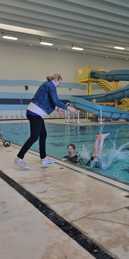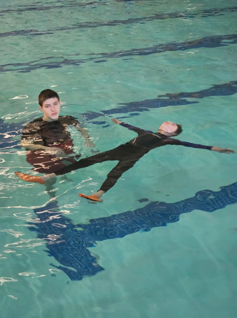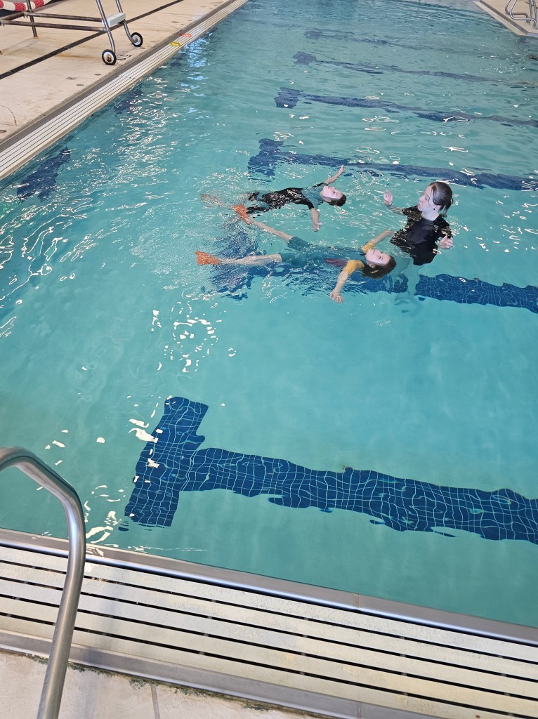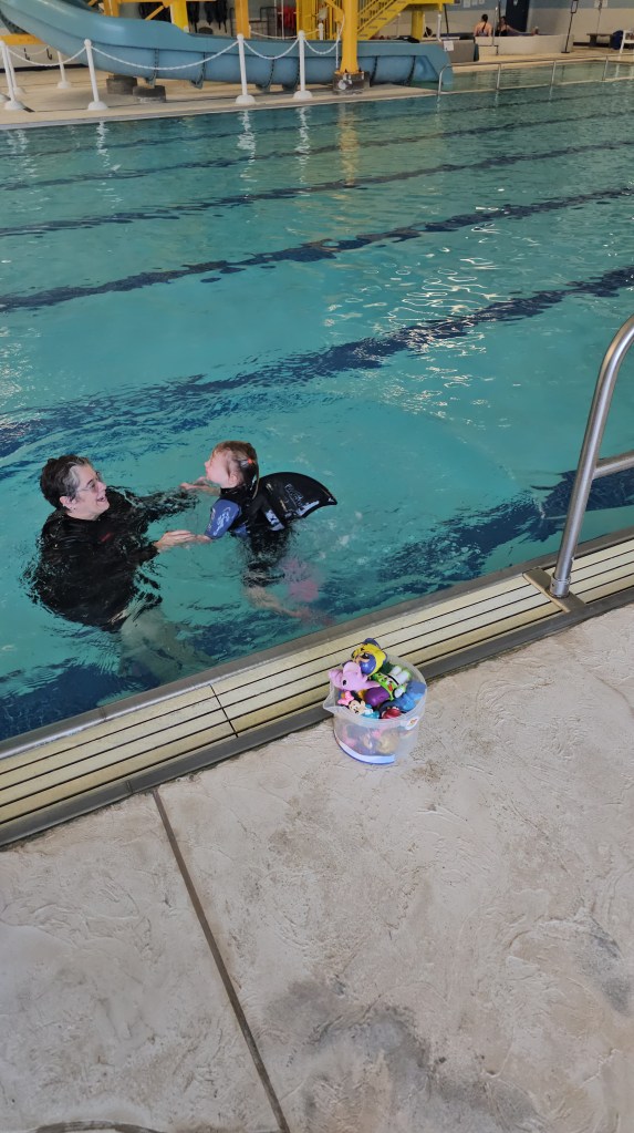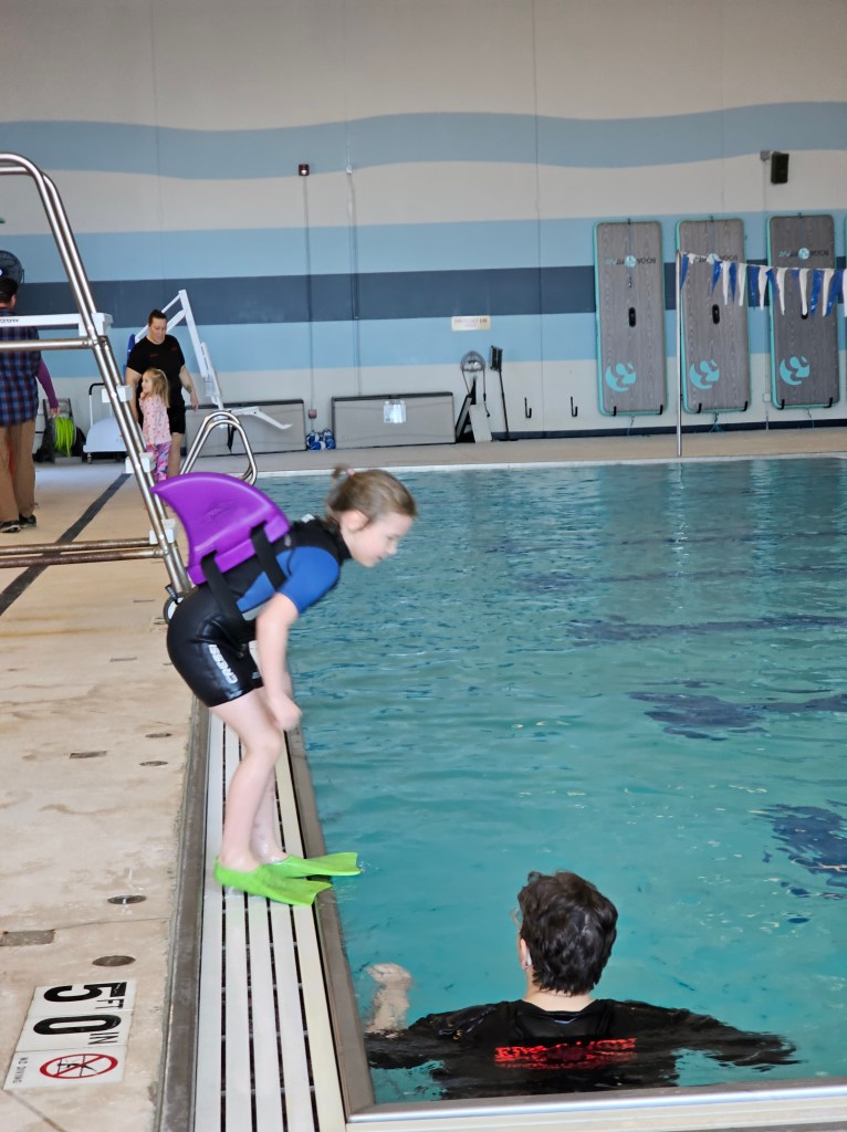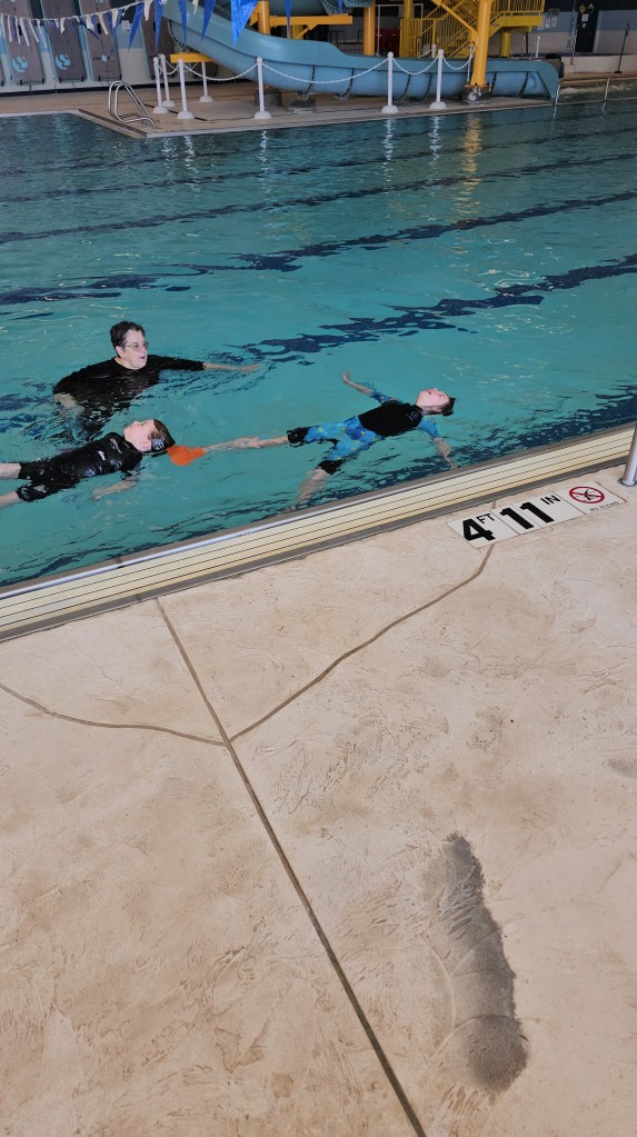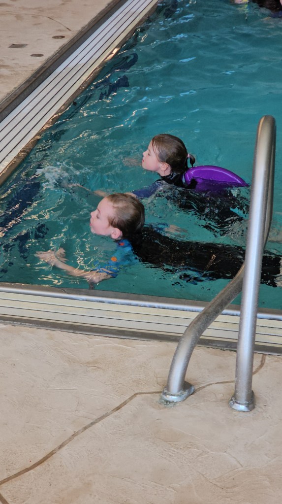 Enter Education for All Squid School. Despite only being four classes in, our kids have progressed in their skills already far surpassing what they learned in eight classes in normal swimming lessons. Not only are the instructors kind and super knowledgeable, they are incredible teachers who have a teaching method which gradually releases kids to be successful in their skills for survival. Depending on their ability levels, kids start with wet suits, flippers, and a fin on. As their skills build, they lose the fin, one flipper, both flippers, and then the wet suit. Then, they begin building up the clothes back on to swim, putting on clothes, pajamas, and even snowsuits to ensure they are able to survive with additional weight and material on. While learning how to swim with clothing on, they also, learn how to remove clothing while still being in the water to lighten up the load. Imagine knowing that your child would not only remain calm if they fell in accidentally while ice-fishing, boating, or walking along a dock, but they could surface and get to a floating position for an extended period of time. Game changer, right?